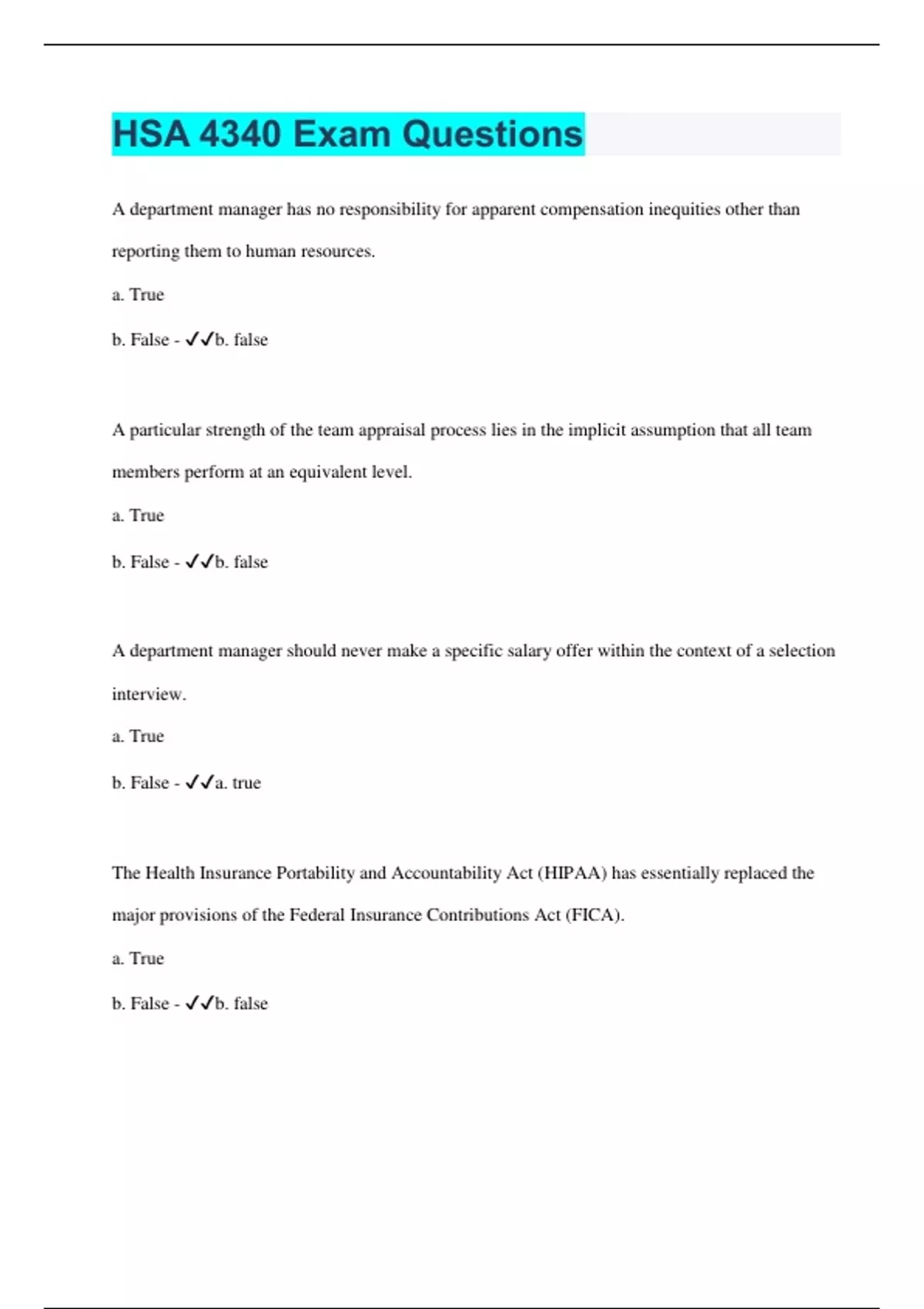 HSA 4340 Exam Questions A department manager has no responsibility for apparent compensation inequities other than reporting them to human resources. a. True b. False - b. false A particular strength of the team appraisal process lies in the implicit assumption that all team members perform at an equivalent level. a. True b. False - b. false A department manager should never make a specific salary offer within the context of a selection interview. a. True b. False - a. true The Health Insurance Portability and Accountability Act (HIPAA) has essentially replaced the major provisions of the Federal Insurance Contributions Act (FICA). a. True b. False - b. false The terms "average" and "standard" are not interchangeable; the actual "average" of a group's performance is always higher than "standard" performance. a. True b. False - a. true Completed performance appraisals can at times be considered legal documentation that the organization could be penalized for discarding. a. True b. False - a. true Workers' Compensation is a benefit that is mandated by law. a. True b. False - a. true It is not necessary for a department manager to know how the compensation systems works because such systems are the responsibility of human resources. a. True b. False - b. false Portable benefits have been an innovation of recent years to serve an increasingly mobile work force. a. True b. False - a. true The benefits most preferred by the majority of employees are health insurance, paid vacations, and flexible sick-time plans. a. True b. False - b. false The single most important objective of performance appraisal is improvement of performance in the job the person presently holds. a. True b. False - a. true There is little value in regularly appraising the performance of an individual who regularly does standard work and can go no higher in position or pay. a. True b. False - b. false The manager should be familiar with current pay scales for all positions in the department and be able to explain to employees how the scales are administered. a. True b. False - a. true It is essential for the department manager to be intimately knowledgeable of all of the organization's benefits plans.