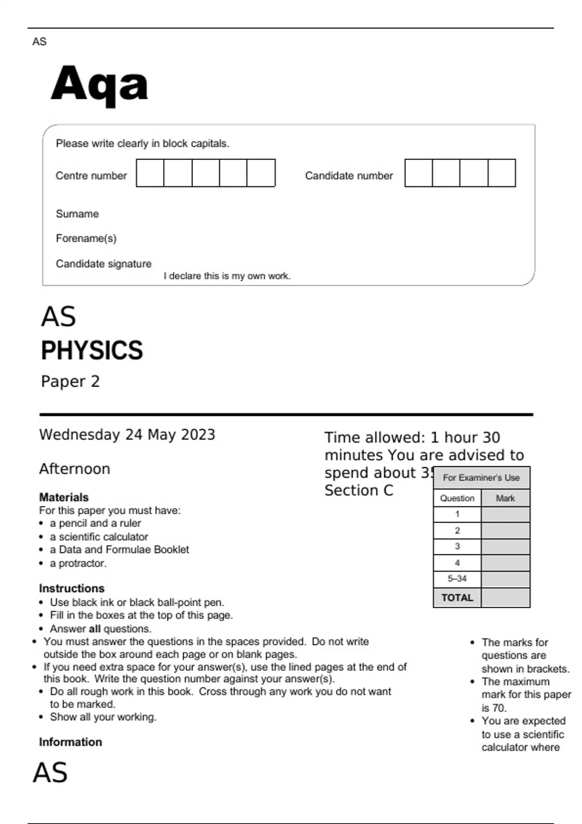 AS PHYSICS Paper 2 Wednesday 24 May 2023 Afternoon Materials For this paper you must have: • a pencil and a ruler • a scientific calculator • a Data and Formulae Booklet • a protractor. Instructions • Use black ink or black ball-point pen. • Fill in the boxes at the top of this page. • Answer all questions. Time allowed: 1 hour 30 minutes You are advised to spend about 35 minutes on Section C • You must answer the questions in the spaces provided. Do not write outside the box around each page or on blank pages. • If you need extra space for your answer(s), use the lined pages at the end of this book. Write the question number against your answer(s). • Do all rough work in this book. Cross through any work you do not want to be marked. • Show all your working. Information • The marks for questions are shown in brackets. • The maximum mark for this paper is 70. • You are expected to use a scientific calculator where appropriate. • A Data and Formulae Booklet is provided as a loose insert. 7407/2 Section A Answer all questions in this section. outside the box 0 1 . 1 Figure 1 shows a micrometer screw gauge. Figure 1 What is the reading on the micrometer? Tick () one box. [1 mark] 6.25 6.75 7.25 8.25 0 1 . 2 A metal wire of diameter d is held in the gap between the anvil and the spindle. Just before the reading of d is taken, the gap is closed using the ratchet and not the thimble. Explain why the gap is closed in this way. [1 mark] 0 1 . 3 The mass per unit length μ of the metal wire is given by ρd 2 μ= 4 where ρ is the density of the metal. Values of d and μ are used to calculate ρ. The percentage uncertainty in d is 1.2%. The percentage uncertainty in μ is 2.0%. Calculate the percentage uncertainty in the result for ρ. [2 marks]