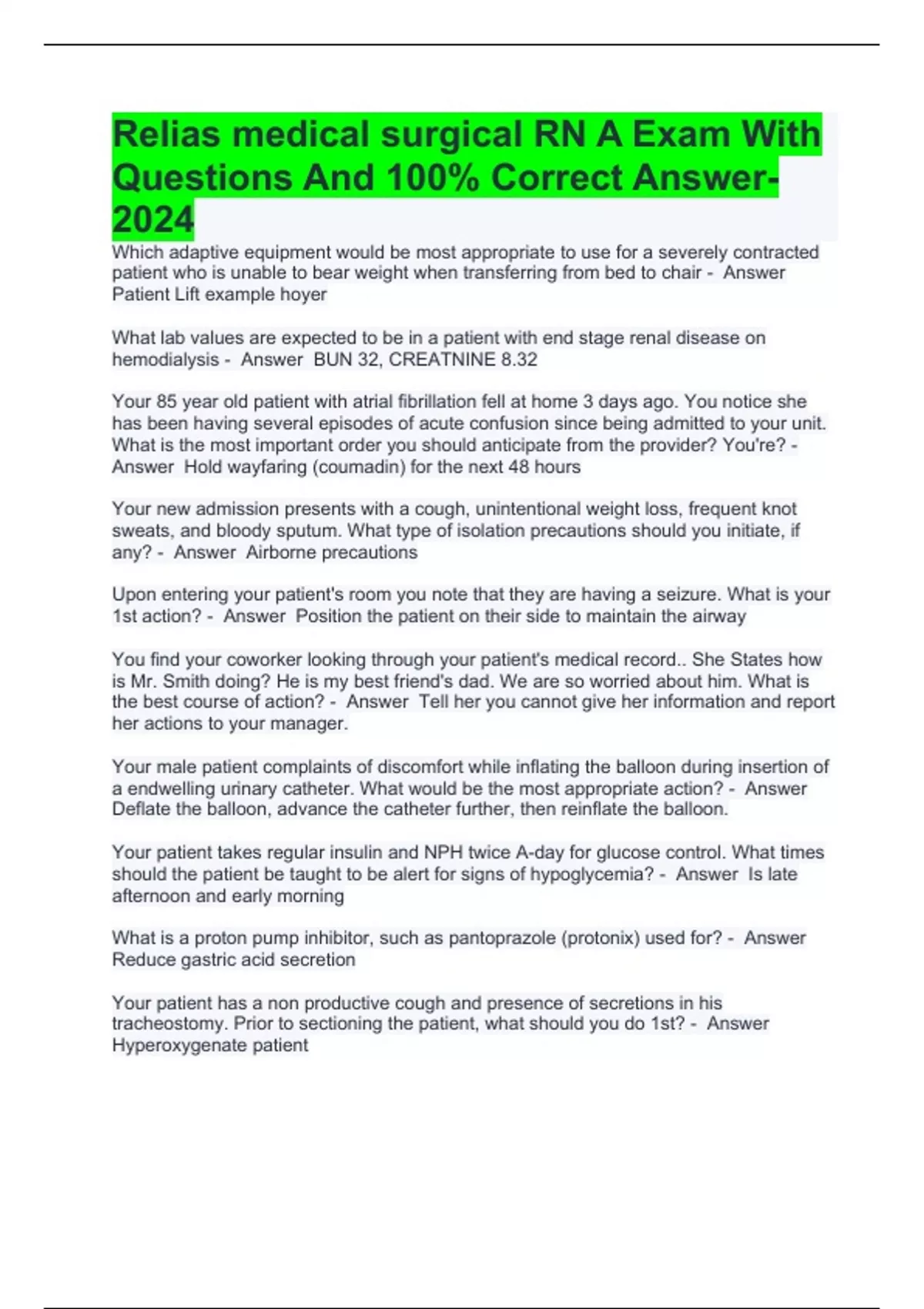 Which adaptive equipment would be most appropriate to use for a severely contracted patient who is unable to bear weight when transferring from bed to chair - Answer Patient Lift example hoyer What lab values are expected to be in a patient with end stage renal disease on hemodialysis - Answer BUN 32, CREATNINE 8.32 Your 85 year old patient with atrial fibrillation fell at home 3 days ago. You notice she has been having several episodes of acute confusion since being admitted to your unit. What is the most important order you should anticipate from the provider? You're? - Answer Hold wayfaring (coumadin) for the next 48 hours Your new admission presents with a cough, unintentional weight loss, frequent knot sweats, and bloody sputum. What type of isolation precautions should you initiate, if any? - Answer Airborne precautions Upon entering your patient's room you note that they are having a seizure. What is your 1st action? - Answer Position the patient on their side to maintain the airway You find your coworker looking through your patient's medical record.. She States how is Mr. Smith doing? He is my best friend's dad. We are so worried about him. What is the best course of action? - Answer Tell her you cannot give her information and report her actions to your manager. Your male patient complaints of discomfort while inflating the balloon during insertion of a endwelling urinary catheter. What would be the most appropriate action? - Answer Deflate the balloon, advance the catheter further, then reinflate the balloon. Your patient takes regular insulin and NPH twice A-day for glucose control. What times should the patient be taught to be alert for signs of hypoglycemia? - Answer Is late afternoon and early morning What is a proton pump inhibitor, such as pantoprazole (protonix) used for? - Answer Reduce gastric acid secretion Your patient has a non productive cough and presence of secretions in his tracheostomy. Prior to sectioning the patient, what should you do 1st? - Answer Hyperoxygenate patient