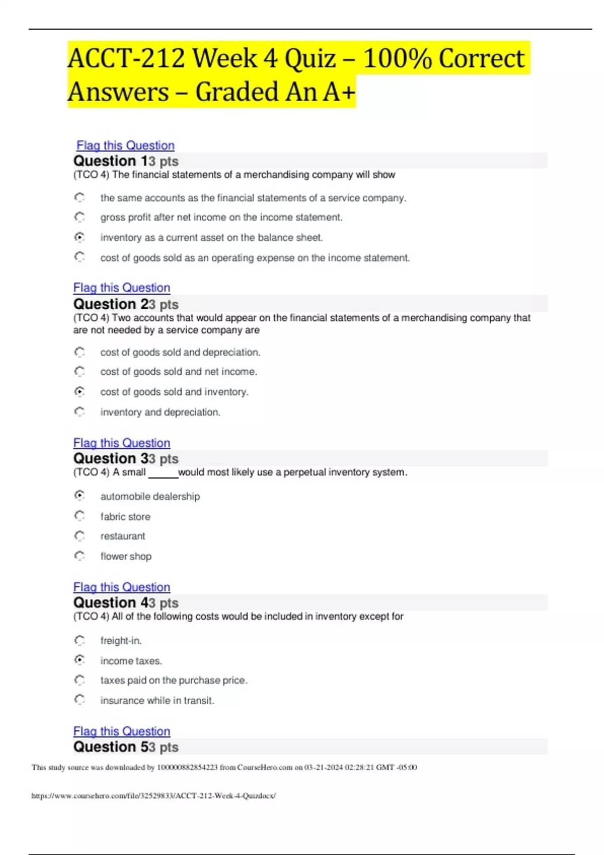 ACCT-212 Week 4 Quiz – 100% Correct Answers – Graded An A+ Flag this Question (TCO 4) The financial statements of a merchandising company will show the same accounts as the financial s tatements of a service company. gross profit after net income on the income statement. inventory as a current asset on the balance sheet. cost of goods sold as an operating expense on the income statement. Flag this Question (TCO 4) Two accounts that would appear on the financial statements of a merchandising company that are not needed by a service company are cost of goods sold and depreciation. cost of goods sold and net income. cost of goods sold and inventory. inventory and depreciation. Flag this Question (TCO 4) A small would most likely use a perpetual inventory system. automobile dealership fabric store restaurant flower shop Flag this Question (TCO 4) All of the following costs would be included in inventory except for freight-in. income taxes. taxes paid on the purchase price. insurance while in transit. Flag this Question (TCO 4) The specific-unit-cost method will produce the highest net income. is also known as the specific identification method. will produce the same ending inventory as the average cost method. is also known as the cost-of-goods sold model. Flag this Question (TCO 4) To determine the average cost per unit the beginning inventory is divided by the number of units available. the cost of goods available is divided by the number of units sold. the purchases for the period are divided by the number of units available. the cost of goods available is divided by the number of units available. Flag this Question (TCO 4) When comparing the results of LIFO and FIFO when inventory costs are decreasing cost of goods sold will be the lowest using FIFO. ending inventory will be the highest using FIFO. cost of goods sold will be the highest using LIFO. ending inventory will be the highest using LIFO. Flag this Question (TCO 4) The principle states that the financial statements of a business must report enough information for outsiders to make knowledgeable decisions about the business. consistency historical cost disclosure conservatism Flag this Question (TCO 4) The lower-of-cost-or-market rule requires a company to report inventories at the lower of historical cost or current sales price. historical cost or current replacement cost. current replacement cost or sales invoice price. FIFO cost or LIFO cost. Flag this Question Question 103 pts (TCO 4) The inventory turnover ratio is determined by dividing cost of goods sold by net sales. shows how many times the company sold its average level of inventory. should be high for a company that sells high-priced inventory items. will be lower for companies that have many low-priced items in their inventory .
