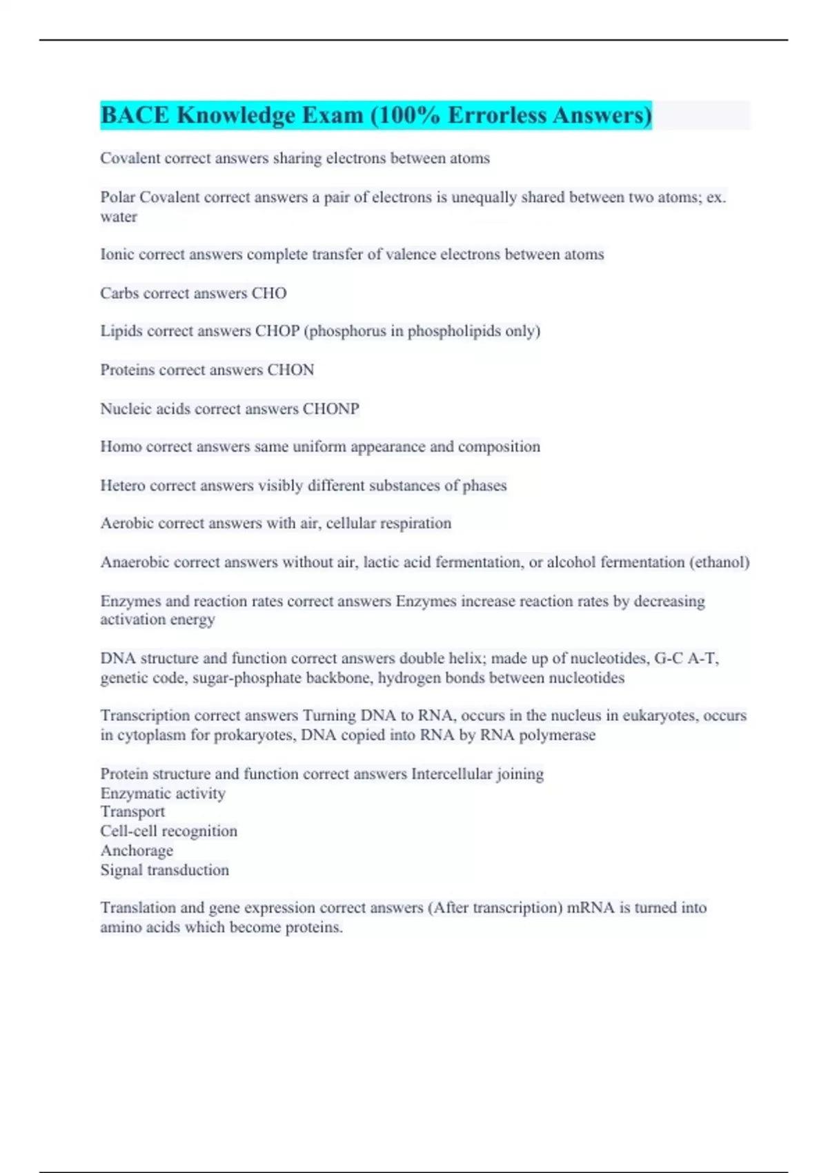 Covalent correct answers sharing electrons between atoms Polar Covalent correct answers a pair of electrons is unequally shared between two atoms; ex. water Ionic correct answers complete transfer of valence electrons between atoms Carbs correct answers CHO Lipids correct answers CHOP (phosphorus in phospholipids only) Proteins correct answers CHON Nucleic acids correct answers CHONP Homo correct answers same uniform appearance and composition Hetero correct answers visibly different substances of phases Aerobic correct answers with air, cellular respiration Anaerobic correct answers without air, lactic acid fermentation, or alcohol fermentation (ethanol) Enzymes and reaction rates correct answers Enzymes increase reaction rates by decreasing activation energy DNA structure and function correct answers double helix; made up of nucleotides, G-C A-T, genetic code, sugar-phosphate backbone, hydrogen bonds between nucleotides Transcription correct answers Turning DNA to RNA, occurs in the nucleus in eukaryotes, occurs in cytoplasm for prokaryotes, DNA copied into RNA by RNA polymerase Protein structure and function correct answers Intercellular joining Enzymatic activity Transport Cell-cell recognition Anchorage Signal transduction Translation and gene expression correct answers (After transcription) mRNA is turned into amino acids which become proteins.