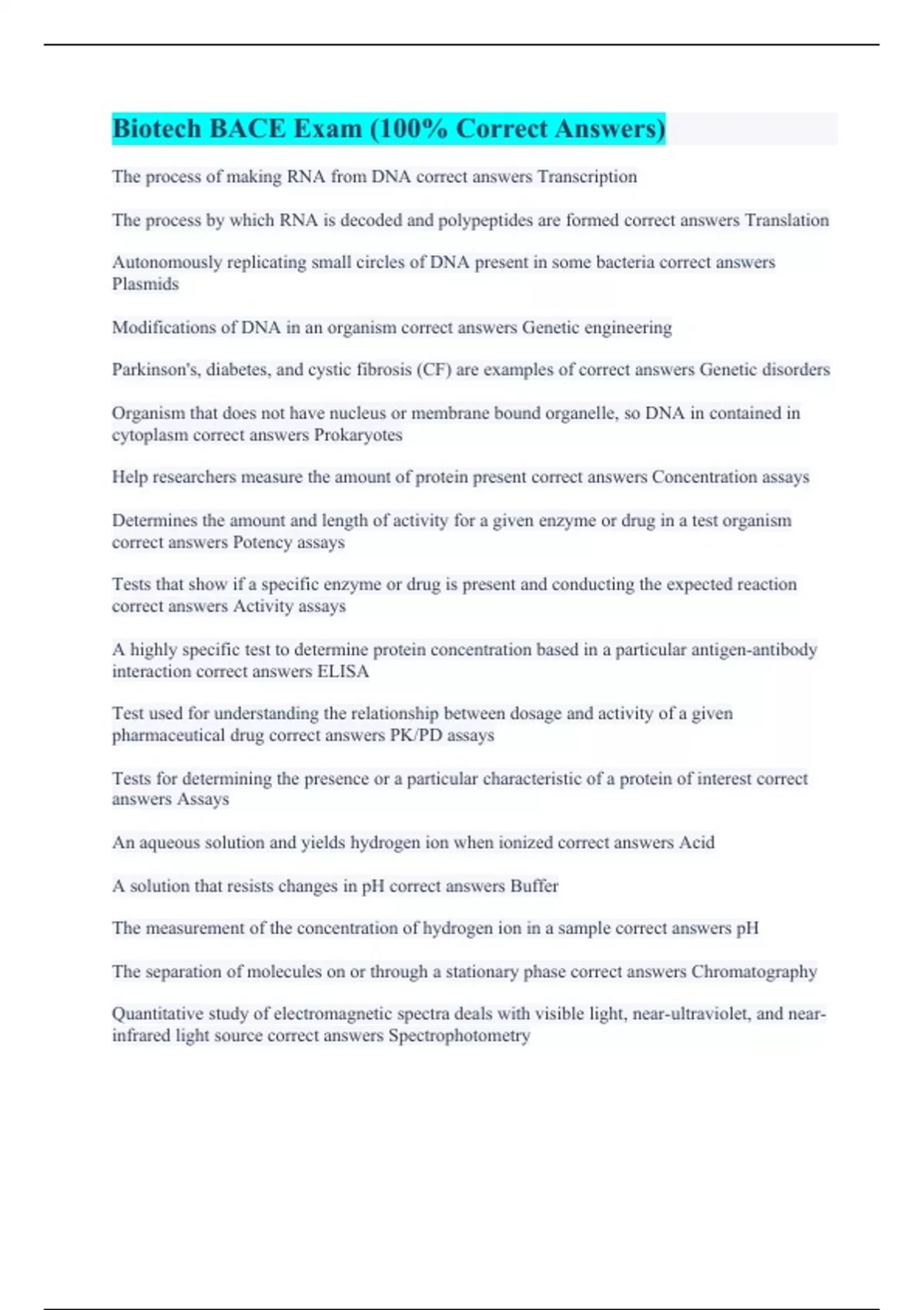 The process of making RNA from DNA correct answers Transcription The process by which RNA is decoded and polypeptides are formed correct answers Translation Autonomously replicating small circles of DNA present in some bacteria correct answers Plasmids Modifications of DNA in an organism correct answers Genetic engineering Parkinson's, diabetes, and cystic fibrosis (CF) are examples of correct answers Genetic disorders Organism that does not have nucleus or membrane bound organelle, so DNA in contained in cytoplasm correct answers Prokaryotes Help researchers measure the amount of protein present correct answers Concentration assays Determines the amount and length of activity for a given enzyme or drug in a test organism correct answers Potency assays Tests that show if a specific enzyme or drug is present and conducting the expected reaction correct answers Activity assays A highly specific test to determine protein concentration based in a particular antigen-antibody interaction correct answers ELISA Test used for understanding the relationship between dosage and activity of a given pharmaceutical drug correct answers PK/PD assays Tests for determining the presence or a particular characteristic of a protein of interest correct answers Assays An aqueous solution and yields hydrogen ion when ionized correct answers Acid A solution that resists changes in pH correct answers Buffer The measurement of the concentration of hydrogen ion in a sample correct answers pH The separation of molecules on or through a stationary phase correct answers Chromatography Quantitative study of electromagnetic spectra deals with visible light, near-ultraviolet, and near-infrared light source correct answers Spectrophotometry