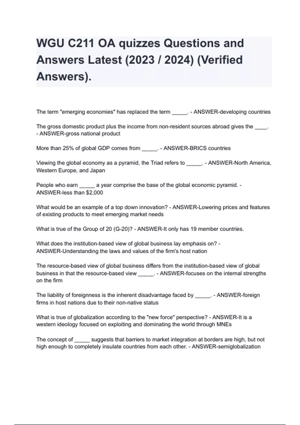 WGU C211 OA quizzes Questions and Answers Latest (2023 / 2024) (Verified Answers). The term "emerging economies" has replaced the term _____. - ANSWER-developing countries The gross domestic product plus the income from non-resident sources abroad gives the ____. - ANSWER-gross national product More than 25% of global GDP comes from _____. - ANSWER-BRICS countries Viewing the global economy as a pyramid, the Triad refers to _____. - ANSWER-North America, Western Europe, and Japan People who earn _____ a year comprise the base of the global economic pyramid. - ANSWER-less than $2,000 What would be an example of a top down innovation? - ANSWER-Lowering prices and features of existing products to meet emerging market needs W