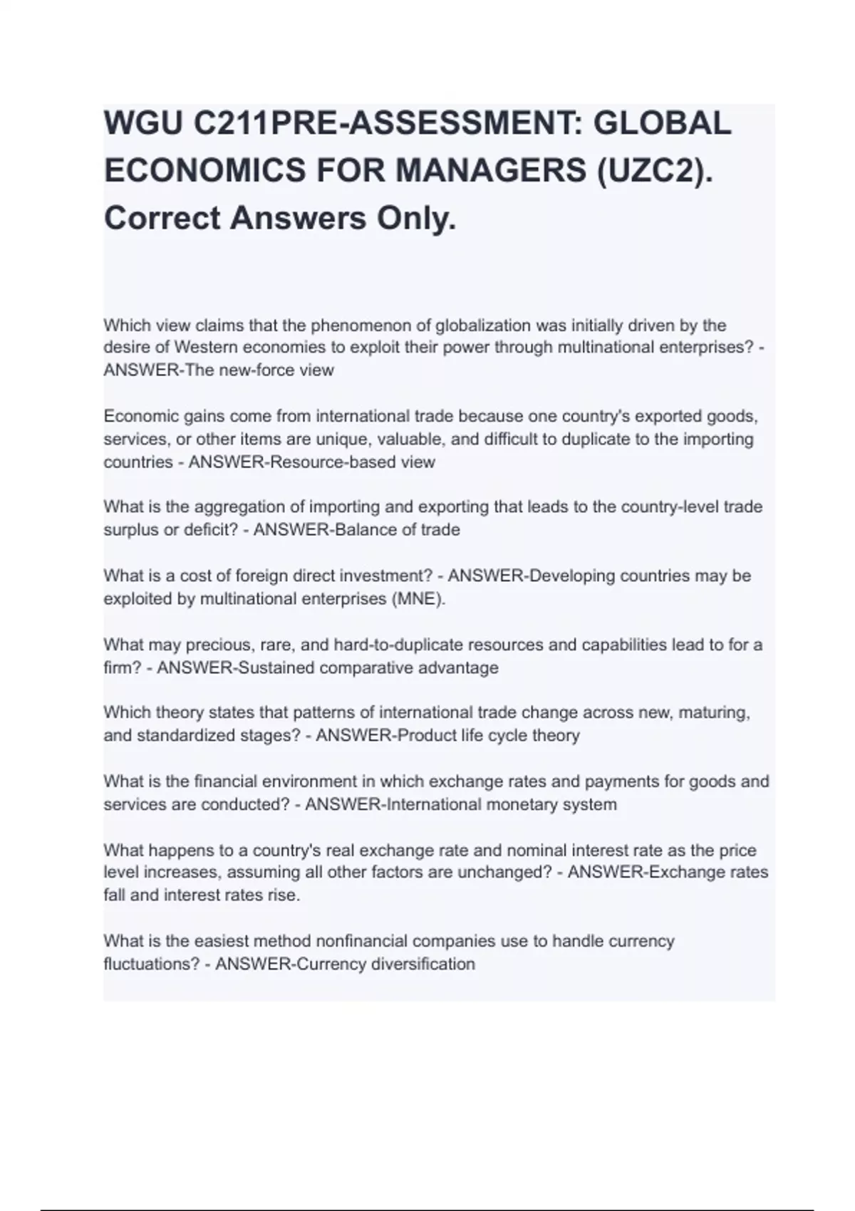 WGU C211PRE-ASSESSMENT: GLOBAL ECONOMICS FOR MANAGERS (UZC2). Correct Answers Only.