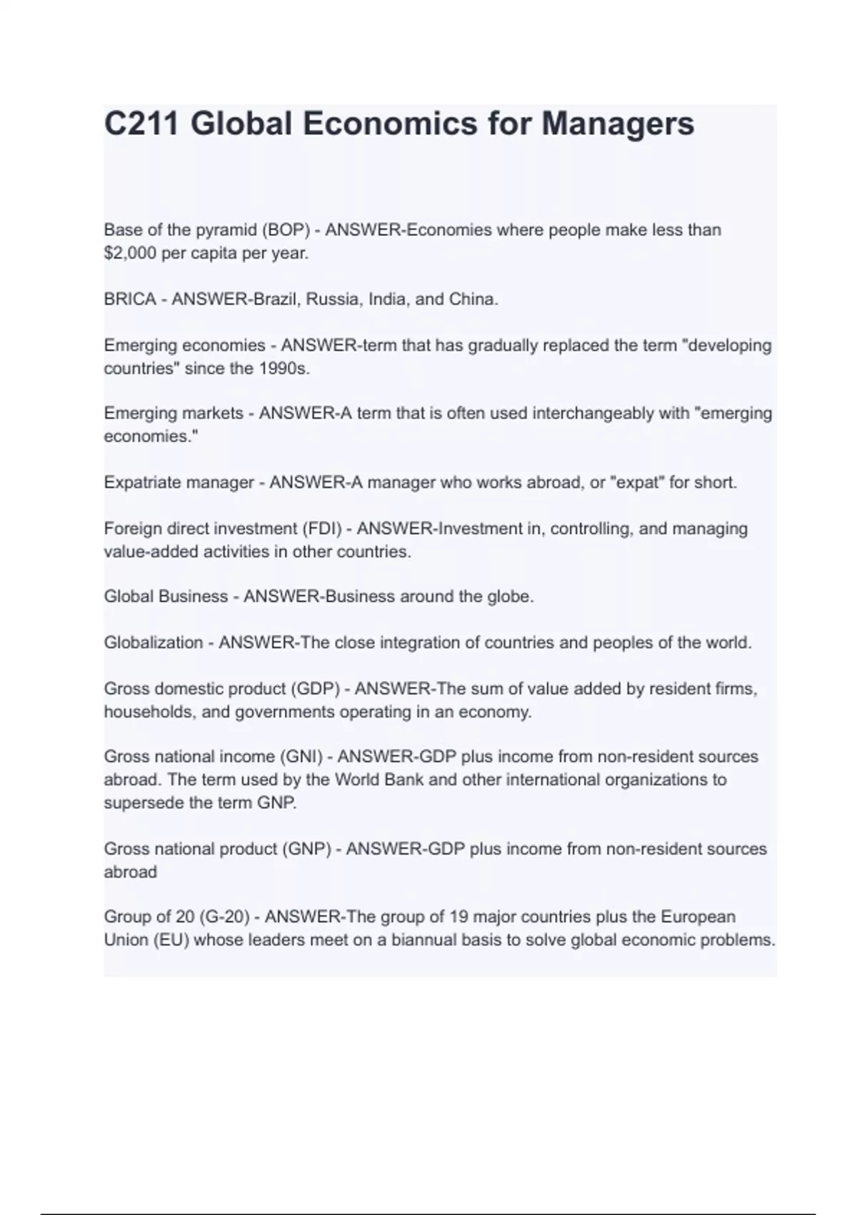 C211 Global Economics for Managers Exam Questions And Answers 2024