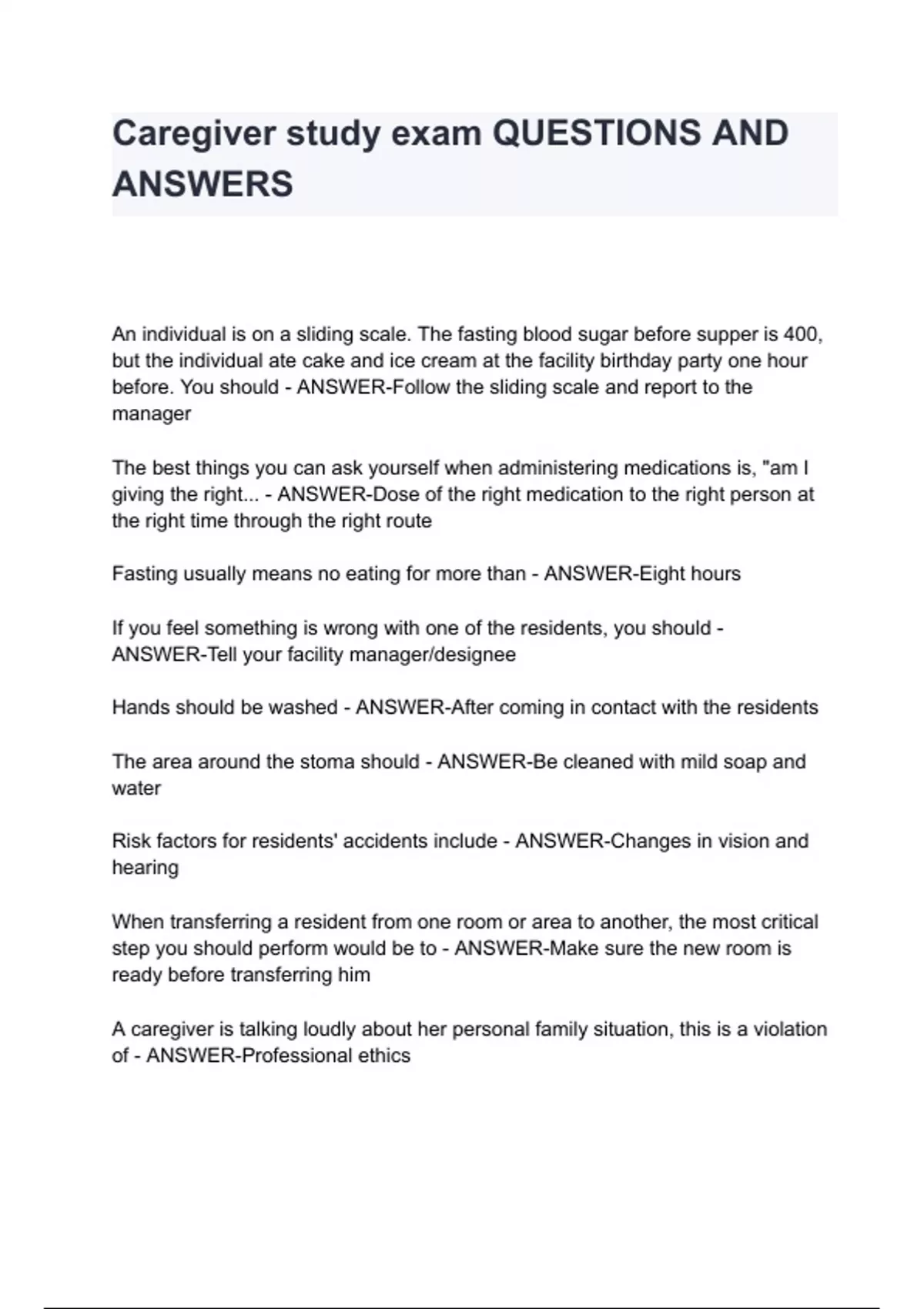 Caregiver study exam QUESTIONS AND ANSWERS An individual is on a sliding scale. The fasting blood sugar before supper is 400, but the individual ate cake and ice cream at the facility birthday party one hour before. You should - ANSWER-Follow the sliding scale and report to the manager The best things you can ask yourself when administering medications is, "am I giving the right... - ANSWER-Dose of the right medication to the right person at the right time through the right route Fasting usually means no eating for more than - ANSWER-Eight hours If you feel something is wrong with one of the residents, you should - ANSWER-Tell your facility manager/designee Hands should be washed - ANSWER-After coming in contact with the residents The area around the stoma should - ANSWER-Be cleaned with mild soap and water Risk factors for residents' accidents include - ANSWER-Changes in vision and hearing When transferring a resident from one room or area to another, the most critical step you should perform would be to - ANSWER-Make sure the new room is ready before transferring him A caregiver is talking loudly about her personal family situation, this is a violation of - ANSWER-P