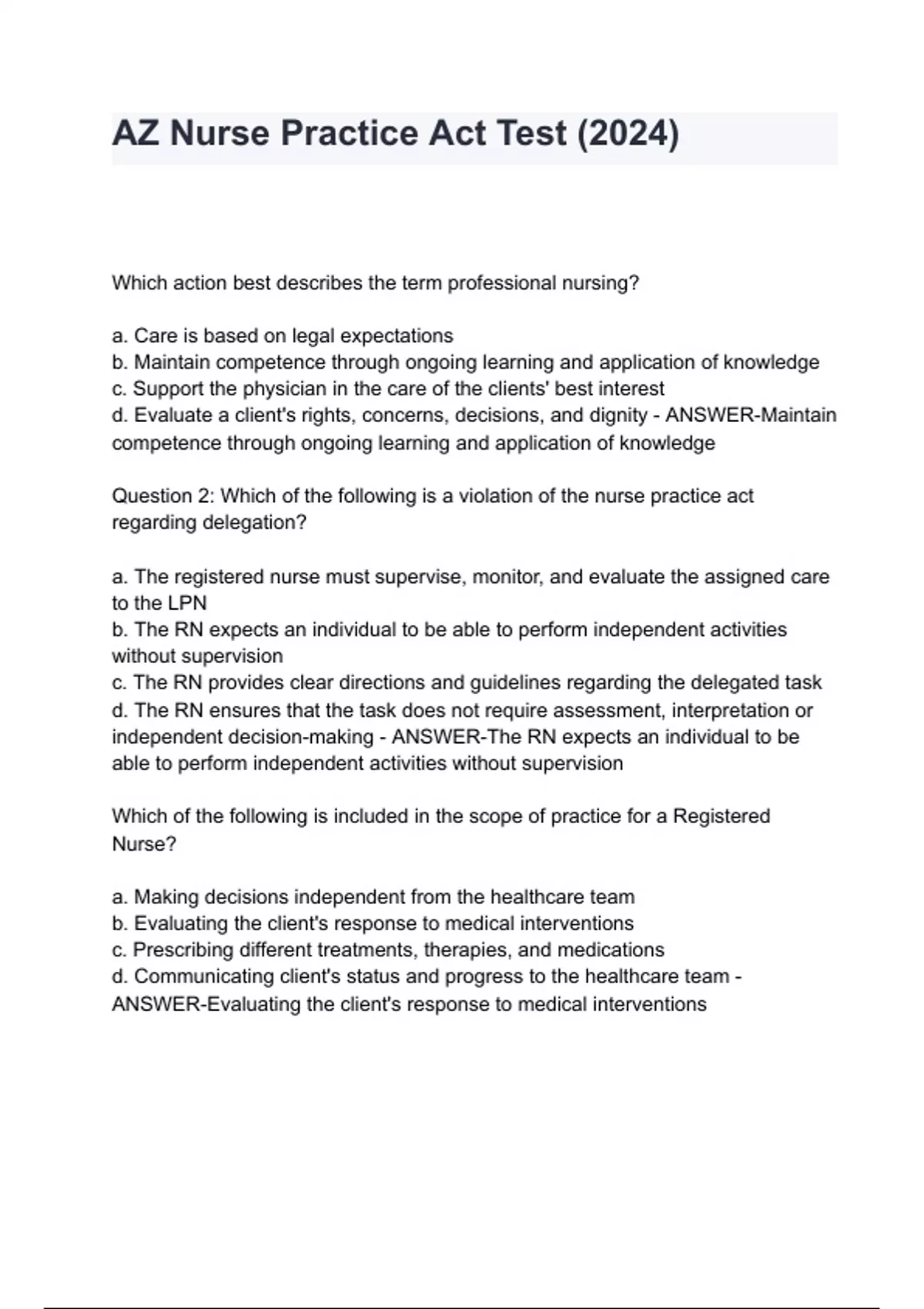 Which action best describes the term professional nursing? a. Care is based on legal expectations b. Maintain competence through ongoing learning and application of knowledge c. Support the physician in the care of the clients' best interest d. Evaluate a client's rights, concerns, decisions, and dignity - ANSWER-Maintain competence through ongoing learning and application of knowledge Question 2: Which of the following is a violation of the nurse practice act regarding delegation? a. The registered nurse must supervise, monitor, and evaluate the assigned care to the LPN b. The RN expects an individual to be able to perform independent activities without supervision c. The RN provides clear directions and guidelines regarding the delegated task d. The RN ensures that the task does not require assessment, interpretation or independent decision-making - ANSWER-The RN expects an individual to be able to perform independent activities without supervision Which of the following is incl