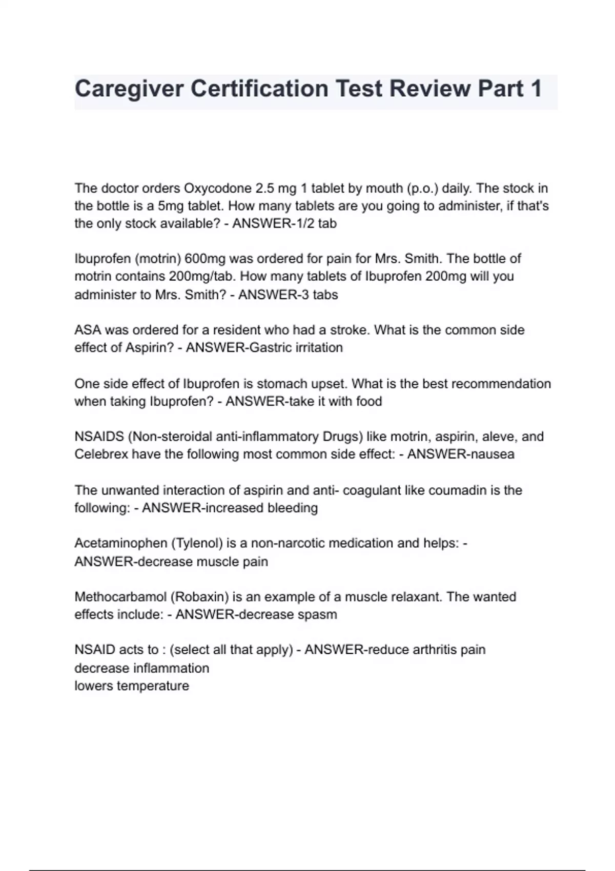 The doctor orders Oxycodone 2.5 mg 1 tablet by mouth (p.o.) daily. The stock in the bottle is a 5mg tablet. How many tablets are you going to administer, if that's the only stock available? - ANSWER-1/2 tab Ibuprofen (motrin) 600mg was ordered for pain for Mrs. Smith. The bottle of motrin contains 200mg/tab. How many tablets of Ibuprofen 200mg will you administer to Mrs. Smith? - ANSWER-3 tabs ASA was ordered for a resident who had a stroke. What is the common side effect of Aspirin? - ANSWER-Gastric irritation One side effect of Ibuprofen is stomach upset. What is the best recommendation when taking Ibuprofen? - ANSWER-take it with food NSAIDS (Non-steroidal anti-inflammatory Drugs) like motrin, aspirin, aleve, and Celebrex have the following most common side effect: - ANSWER-nausea The unwanted interaction of aspirin and anti- coagulant like coumadin is the following: - ANSWER-increased bleeding Acetaminophen (Tylenol) is a non-narcotic medication and helps: - ANSWER-decreas