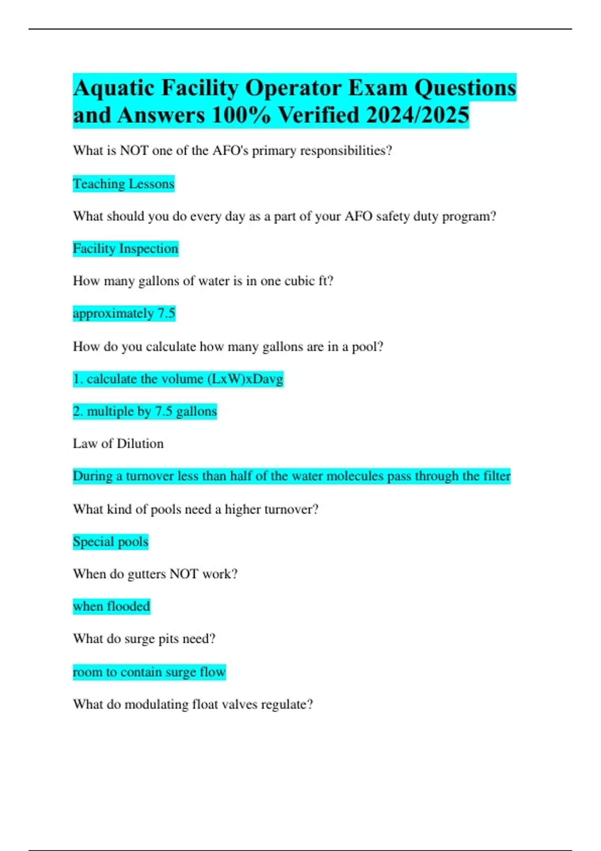Aquatic Facility Operator Exam Questions and Answers 100% Verified 2024/2025