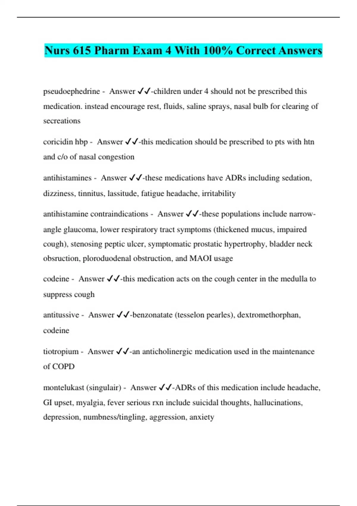 Nurs 615 Pharm Exam 4 With 100% Correct Answers pseudoephedrine - Answer ️️ -children under 4 should not be prescribed this medication. instead encourage rest, fluids, saline sprays, nasal bulb for clearing of secreations coricidin hbp - Answer ️️ -this medication should be prescribed to pts with htn and c/o of nasal congestion antihistamines - Answer ️️ -these medications have ADRs including sedation, dizziness, tinnitus, lassitude, fatigue headache, irritability antihistamine contraindications - Answer ️️ -these populations include narrow- angle glaucoma, lower respiratory tract symptoms (thickened mucus, impaired cough), stenosing peptic ulcer, symptomatic prostatic hypertrophy, bladder neck obsruction, ploroduodenal obstruction, and MAOI usage codeine - Answer ️️ -this medication acts on the cough center in the medulla to suppress cough antitussive - Answer ️️ -benzonatate (tesselon pearles), dextromethorphan, codeine tiotropium - Answer ️️ -an anticholinergic medication used in the maintenance of COPD montelukast (singulair) - Answer ️️ -ADRs of this medication include headache, GI upset, myalgia, fever serious rxn include suicidal thoughts, hallucinations, depression, numbness/tingling, aggression, anxiety montelukast (singulair) - Answer ️️ -take this medication even if symptom free, not used for acute asthma episodes instead should use bronchodilator if needed long acting beta agonists - Answer ️️ -african americans should not be prescribed this class of medications due to a black box warning in deaths from salmeterol, formoterol inhaled corticosteroids - Answer ️️ -patients should use spacer for greater percentage of drug delivery. also should rinse with water and spit to decrease risk for developing oral candidiasis albuterol - Answer ️️ -inhaled beta agonists, relaxation of airway smooth muscles by increasing cAMP inhaled corticosteroids - Answer ️️ -unknown but thought to inhibit igE and mast cell migrations into bronchial tissue short acting beta agonists - Answer ️️ -appropriate for use for bronchospasm r/t asthma, bronchitis, copd. rescue inhale -albuterol, levalbuterol inhaled muscarinic receptor antagonists - Answer ️️ -block muscarinic receptors, decrease formation of cGMP leading t