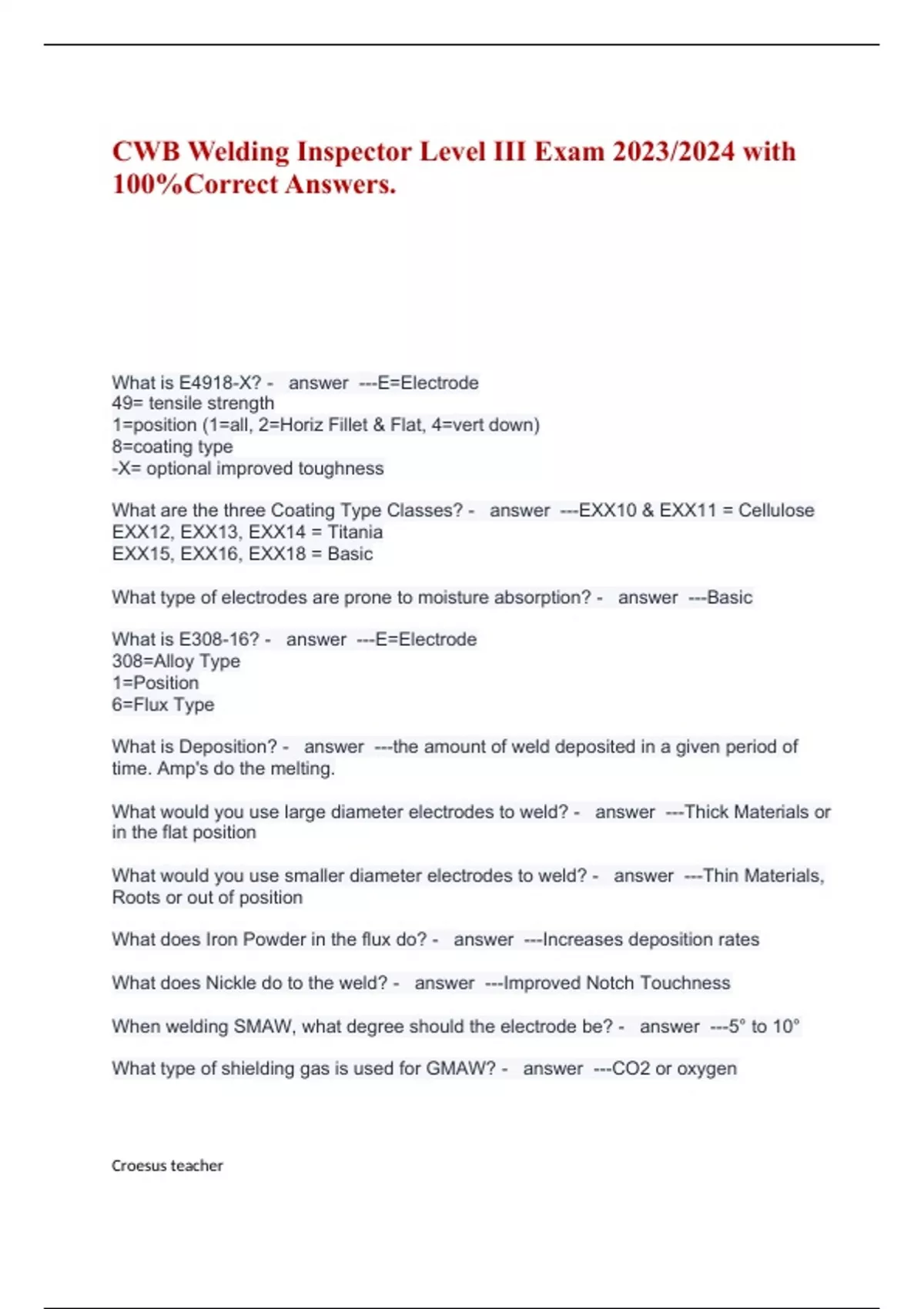 What is E4918-X? - answer ---E=Electrode 49= tensile strength 1=position (1=all, 2=Horiz Fillet & Flat, 4=vert down) 8=coating type -X= optional improved toughness What are the three Coating Type Classes? - answer ---EXX10 & EXX11 = Cellulose EXX12, EXX13, EXX14 = Titania EXX15, EXX16, EXX18 = Basic What type of electrodes are prone to moisture absorption? - answer ---Basic What is E308-16? - answer ---E=Electrode 308=Alloy Type 1=Position 6=Flux Type What is Deposition? - answer ---the amount of weld deposited in a given period of time. Amp's do the melting. What would you use large diameter electrodes to weld? - answer ---Thick Materials or in the flat position What would you use smaller diameter electrodes to weld? - answer ---Thin Materials, Roots or out of position What does Iron Powder in the flux do? - answer ---Increases deposition rates What does Nickle do to the weld? - answer ---Improved Notch Touchness When welding SMAW, what degree should the electrode be? - answer ---5° to 10° What type of shielding gas is used for GMAW? - answer ---CO2 or oxygen
