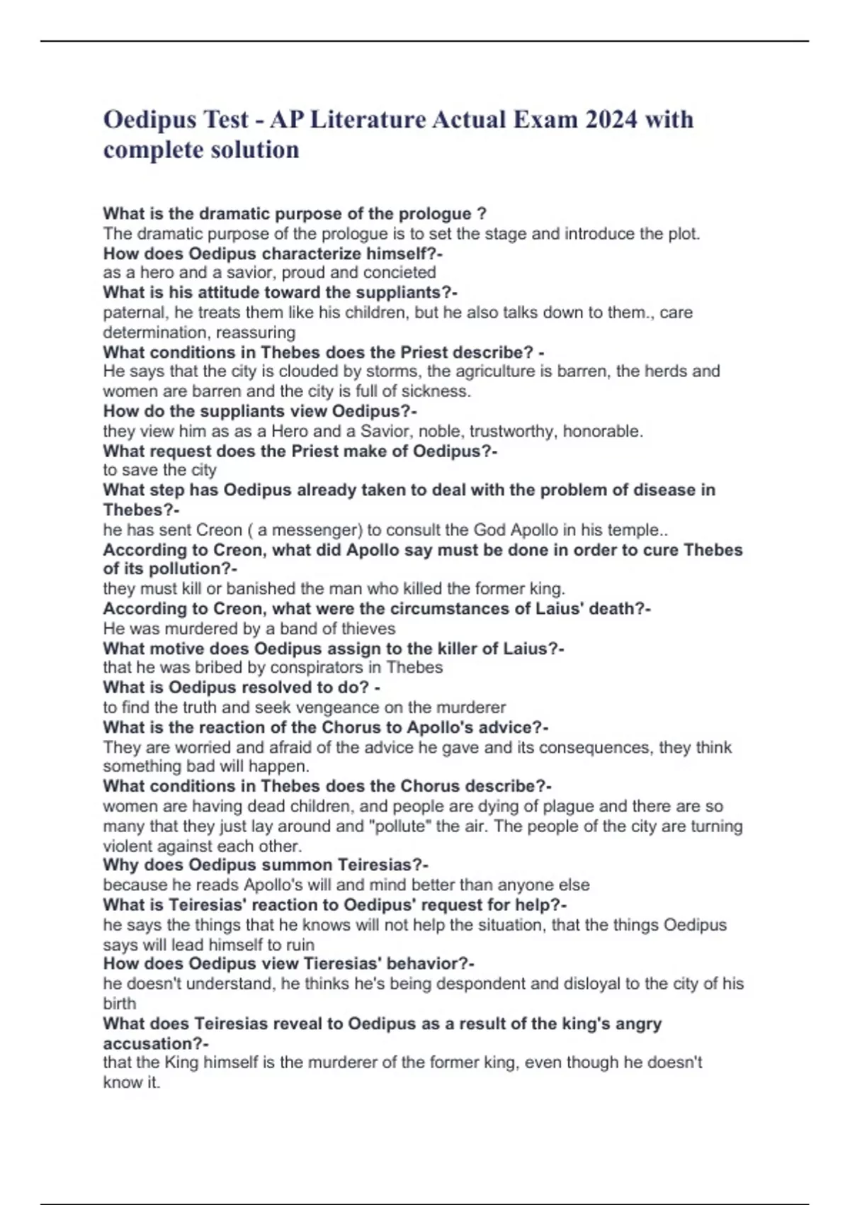 Oedipus Test - AP Literature Actual Exam 2024 with complete solution What is the dramatic purpose of the prologue ? The dramatic purpose of the prologue is to set the stage and introduce the plot. How does Oedipus characterize himself?- as a hero and a savior, proud and concieted What is his attitude toward the suppliants?- paternal, he treats them like his children, but he also talks down to them., care determination, reassuring What conditions in Thebes does the Priest describe? - He says that the city is clouded by storms, the agriculture is barren, the herds and women are barren and the city is full of sickness. How do the suppliants view Oedipus?- they view him as as a Hero and a Savior, noble, trustworthy, honorable. What request does the Priest make of Oedipus?- to save the city What step has Oedipus already taken to deal with the problem of disease in Thebes?- he has sent Creon ( a messenger) to consult the God Apollo in his temple.. According to Creon, what did Apollo say must be done in order to cure Thebes of its pollution?- they must kill or banished the man who killed the former king. According to Creon, what were the circumstances of Laius' death?- He was murdered by a band of thieves What motive does Oedipus assign to the killer of Laius?- that he was bribed by conspirators in Thebes What is Oedipus resolved to do? - to find the truth and seek vengeance on the murderer What is the reaction of the Chorus to Apollo's advice?- They are worried and afraid of the advice he gave and its consequences, they think something bad will happen. What conditions in Thebes does the Chorus describe?- women are having dead children, and people are dying of plague and there are so many that they just lay around and "pollute" the air. The people of the city are turning violent against each other. Why does Oedipus summon Teiresias?- because he reads Apollo's will and mind better than anyone else What is Teiresias' reaction to Oedipus' request for help?- he says the things that he knows will not help the situation, that the things Oedipus says will lead himself to ruin How does Oedipus view Tieresias' behavior?- he doesn't understand, he thinks he's being despondent and disloyal to the city of his birth What does Teiresias reveal to Oedipus as a result of the king's angry accusation?- that the King himself is the murderer of the former king, even though he doesn't know it. What suspicion does Oedipus begin to harbor about Creon?-