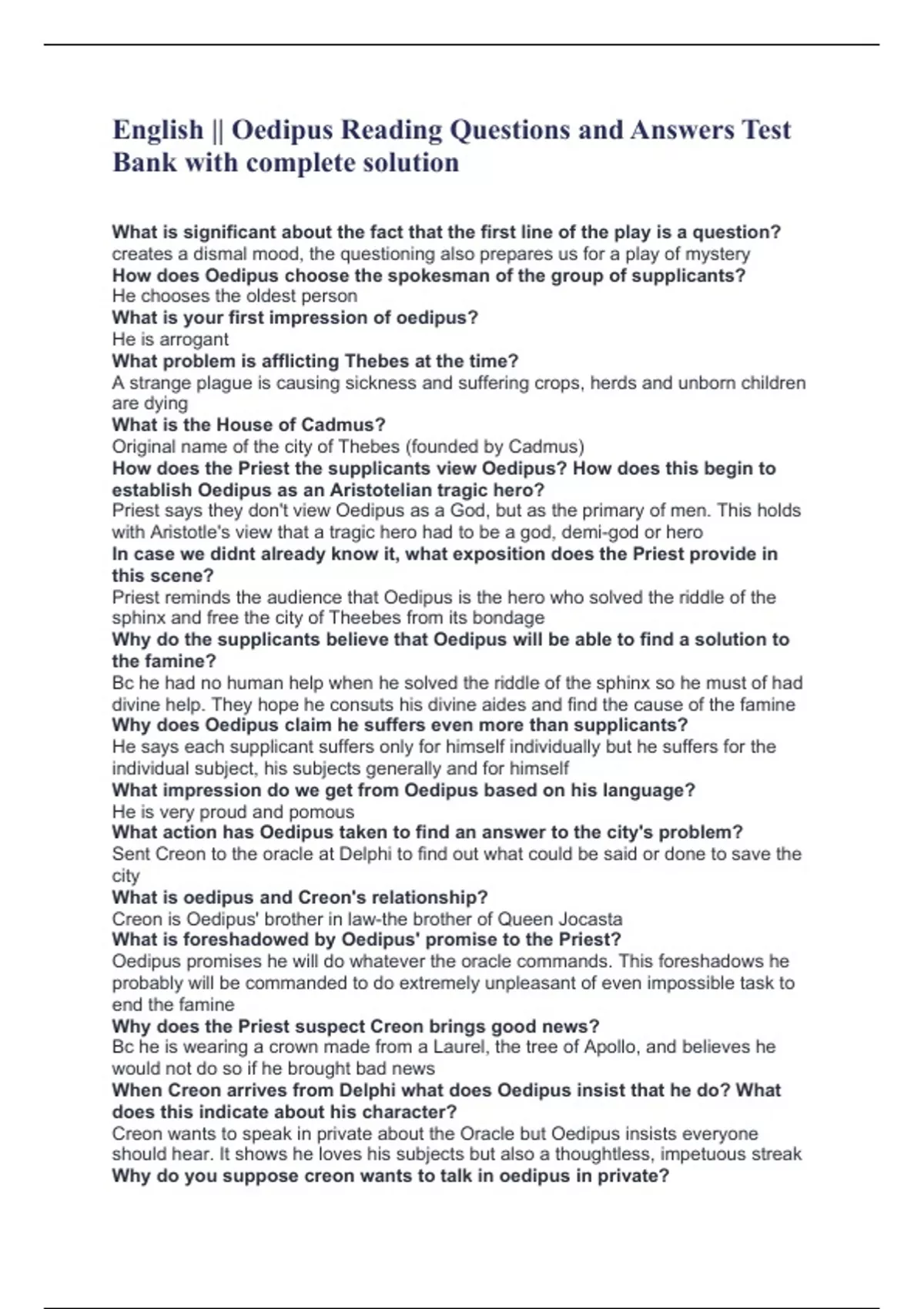 English || Oedipus Reading Questions and Answers Test Bank with complete solution
