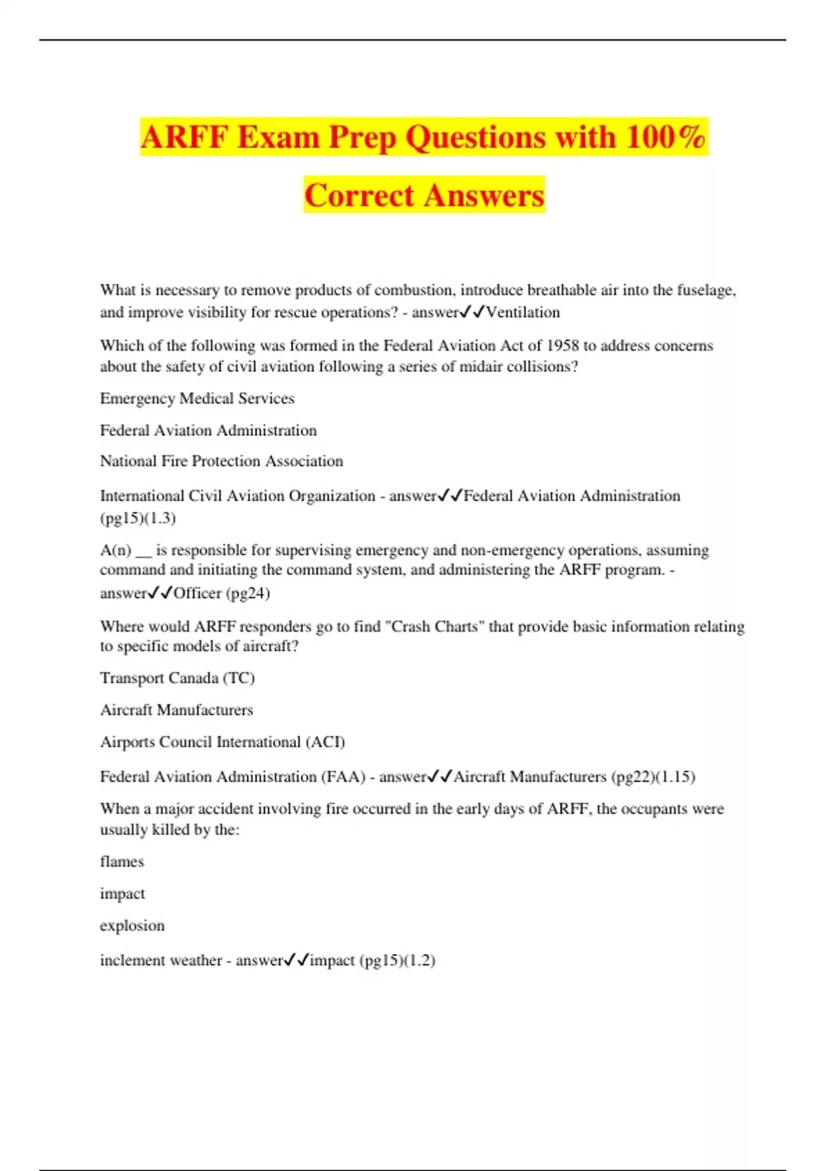 ARFF Exam Prep Questions with 100% Correct Answers What is necessary to remove products of combustion, introduce breathable air into the fuselage, and improve visibility for rescue operations? - answerVentilation Which of the following was formed in the Federal Aviation Act of 1958 to address concerns about the safety of civil aviation following a series of midair collisions? Emergency Medical Services Federal Aviation Administration National Fire Protection Association International Civil Aviation Organization - answerFederal Aviation Administration (pg15)(1.3) A(n) __ is responsible for supervising emergency and non-emergency operations, assuming command and initiating the command system, and administering the ARFF program. - answerOfficer (pg24) Where would ARFF responders go to find "Crash Charts" that provide basic information relating to specific models of aircraft? Transport Canada (TC) Aircraft Manufacturers Airports Council International (ACI) Federal Aviation Administration (FAA) - answerAircraft Manufacturers (pg22)(1.15) When a major accident involving fire occurred in the early days of ARFF, the occupants were usually killed by the: flames impact explosion inclement weather - answerimpact (pg15)(1.2) In most fire departments, who is required to perform routine inspections and preventive maintenance checks? - answerDriver/Operator (Pg 34) The ARFF driver/operator is responsible for safety: - answertransporting firefighters, apparatus, agent, and equipment (pg 32) What is the result of ARFF personnel staffing dropping below minimum staffing requirements? Reduction of aircraft accidents and possible airport shutdown. Increased training for reduced ARFF staff and possible airport shutdown. Reduction of the airport's flight operations and possible airport shutdown. Increase in computer-based training for remaining staff and possible airport shutdown. - answerReduction of the airport's flight operations and possible airport shutdown (pg24)(1.22) It is important for airport firefighters to identify airport structures and terrain features because: FAA AC 150/5210-17 requires it. Air traffic control communicates positions via landmarks. They may affect, limit, or prevent ARFF response capabilities. Grid maps should not be used during aircraft incidents/accidnets. - answerthey may affect, limit, or prevent ARFF response capabilities (pg 27)(1.28) What is the primary reason for exercising caution when using power tools and/or friction-causing machinery while performing rescues? They may be ignition sources. They cannot be used on composite materials. They are more likely to cause passenger injuries. They will produce dust and put other particulates into the air. - answerThey may be ignition sources (pg 31)(1.39) Which of the following is the BEST source for cockpit voice recorder transcripts and recordings? AirS AirD Aviation Fire Journal (AFJ) Airport Fire Officers Association (AFOA) - answerAirD (pg 22) Which of the following BEST describes who is responsible for inspection, limited maintenance, and operation of ARFF apparatus and fire fighting systems during emergency and non- emergency operations? Officer Driver/operator Airport Firefighter Rescue Team Member - answerDriver/Operator (pg 24) Which agency ensures that dangerous materials and weapons are not brought onto transportation vehicles? Federal Aviation Administration (FAA) National Transportation Safety Board (NTSB) Transportation Security Administration (TSA) International Air Transport Association (IATA) - answerTransportation Security Administration (TSA) (pg 19) Which of the following is considered a target hazard area that an airport firefighter must be able to identify? Taxiway Airport exits Control tower Aircraft maintenance facilities - answerAircraft maintenance facilities (pg 27) The National Transportation Safety Board (NTSB) is an agency of the U.S. Department of Transportation tasked with: Securing the national transportation systems within the United States. Developing technical consensus standards, fire training, and public fire education materials. Determining the probable cause of aircraft accidents as well as incidents involving other modes of transportation. Developing and adopting standards and approved practices for international civil aviation that relate to ARFF. - answerDetermining the probable cause of aircraft accidents as well as incidents involving other modes of transportation. (pg 19)(1.8) What is the purpose of the Joint Aviation Authority (JAA)? To develop and adopt standards and approve practices for international civil aviation.