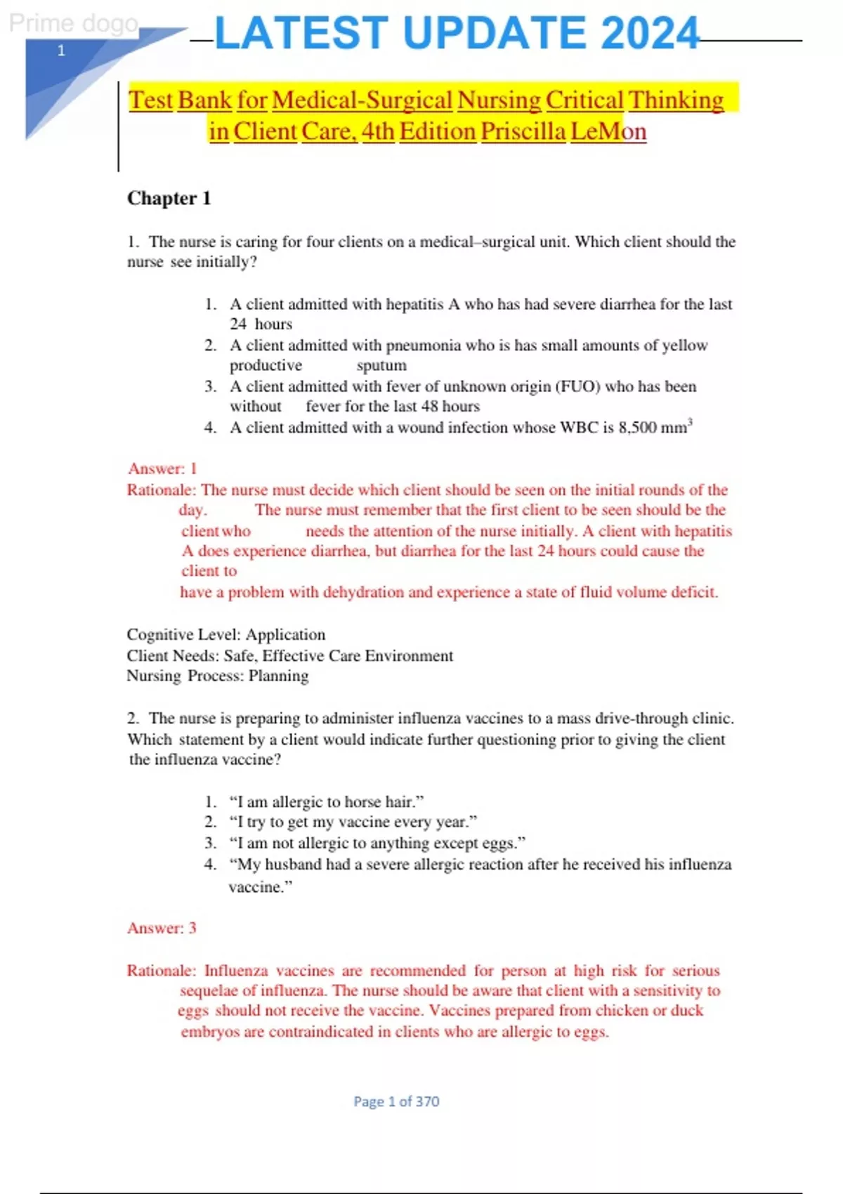 Test bank for medical surgical nursing critical thinking in client care 4th edition priscilla lemon All chapters fully covered Latest update 2024