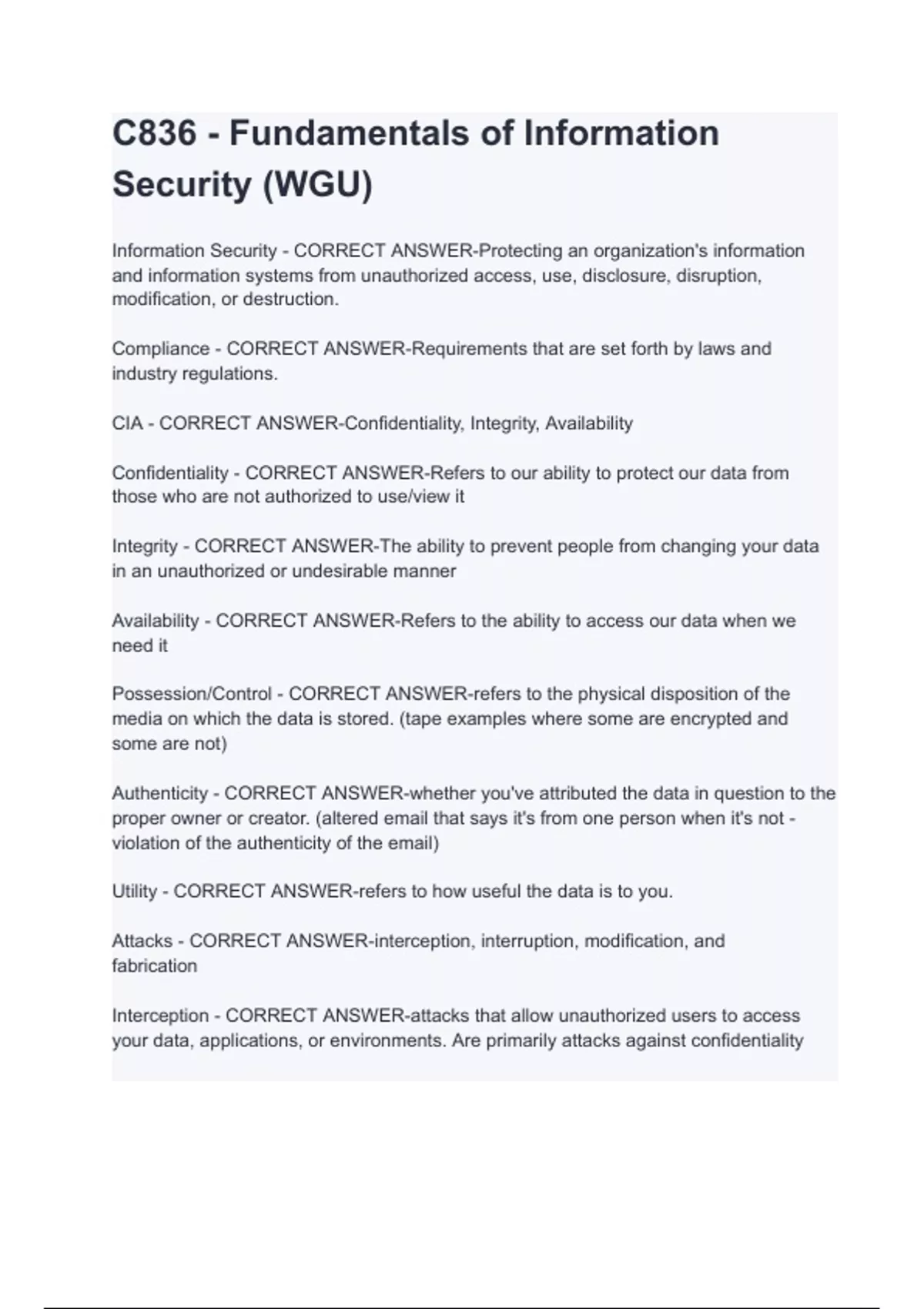 Information Security - CORRECT ANSWER-Protecting an organization's information and information systems from unauthorized access, use, disclosure, disruption, modification, or destruction. Compliance - CORRECT ANSWER-Requirements that are set forth by laws and industry regulations. CIA - CORRECT ANSWER-Confidentiality, Integrity, Availability Confidentiality - CORRECT ANSWER-Refers to our ability to protect our data from those who are not authorized to use/view it Integrity - CORRECT ANSWER-The ability to prevent people from changing your data in an unauthorized or undesirable manner Availability - CORRECT ANSWER-Refers to the ability to access our data when we need it Possession/Control - CORRECT ANSWER-refers to the physical disposition of the media on which the data is stored. (tape examples where some are encrypted and some are not) Authenticity - CORRECT ANSWER-whether you've attributed the data in question to the proper owner or creator. (altered email that says it's from one person when it's not - violation of the authenticity of the email) Utility - CORRECT ANSWER-refers to how useful the data is to you. Attacks - CORRECT ANSW