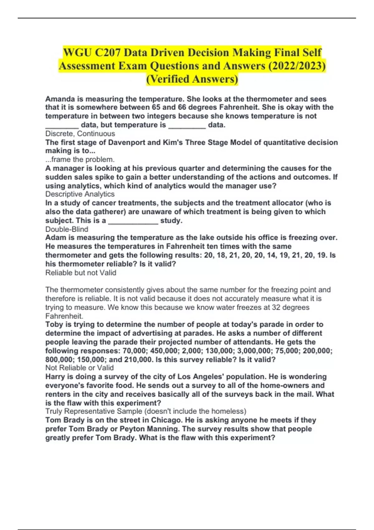 WGU C207 Data Driven Decision Making Final Self Assessment Exam Questions and Answers (2022/2023) (Verified Answers) Amanda is measuring the temperature. She looks at the thermometer and sees that it is somewhere between 65 and 66 degrees Fahrenheit. She is okay with the temperature in between two integers because she knows temperature is not ________ data, but temperature is _________ data. Discrete, Continuous The first stage of Davenport and Kim's Three Stage Model of quantitative decision making is to... ...frame the problem. A manager is looking at his previous quarter and determining the causes for the sudden sales spike to gain a better understanding of the actions and outcomes. If using analytics, which kind of analytics would the manager use? Descriptive Analytics In a study of cancer treatments, the subjects and the treatment allocator (who is also the data gatherer) are unaware of which treatment is being given to which subject. This is a ____________ study. Double-Blind Adam is measuring the temperature as the lake outside his office is freezing over. He measures the temperatures in Fahrenheit ten times with the same thermometer and gets the following results: 20, 18, 21, 20, 20, 14, 19, 21, 20, 19. Is his thermometer reliable? Is it valid? Reliable but not Valid The thermometer consistently gives about the same number for the freezing point and therefore is reliable. It is not valid because it does not accurately measure what it is trying to measure. We know this because we know water freezes at 32 degrees Fahrenheit. Toby is trying to determine the number of people at today's parade in order to determine the impact of advertising at parades. He asks a number of different people leaving the parade their projected number of attendants. He gets the