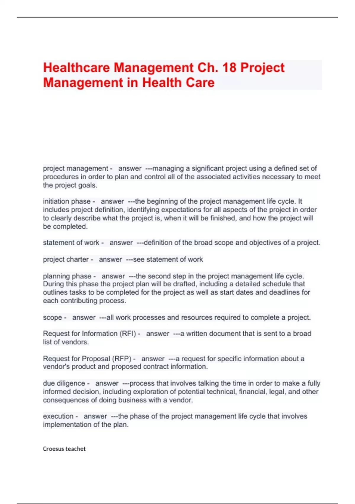 project management - answer ---managing a significant project using a defined set of procedures in order to plan and control all of the associated activities necessary to meet the project goals. initiation phase - answer ---the beginning of the project management life cycle. It includes project definition, identifying expectations for all aspects of the project in order to clearly describe what the project is, when it will be finished, and how the project will be completed. statement of work - answer ---definition of the broad scope and objectives of a project. project charter - answer ---see statement of work planning phase - answer ---the second step in the project management life cycle. During this phase the project plan will be drafted, including a detailed schedule that outlines tasks to be completed for the project as well as start dates and deadlines for each contributing process. scope - answer ---all work processes and resources required to complete a project. Request for Information (RFI) - answer ---a written document that is sent to a broad list of vendors. Request for Proposal (RFP) - answer ---a request for specific information about a vendor's product and proposed contract information. due diligence - answer ---process that involves talking the time in order to make a fully informed decision, including exploration of potential technical, financial, legal, and other consequences of doing business with a vendor. execution - answer ---the phase of the project management life cycle that involves implementation of the plan.