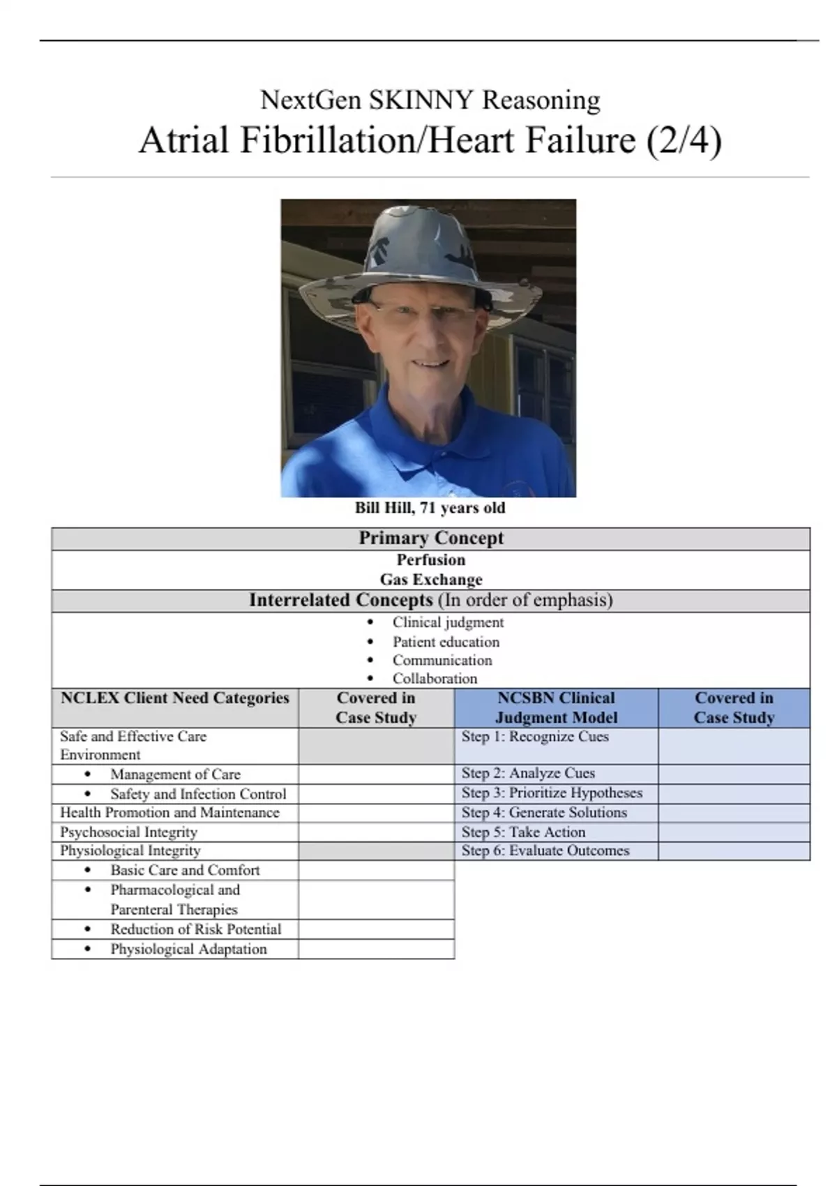 NextGen SKINNY Reasoning Atrial Fibrillation/Heart Failure (2/4) Bill Hill, 71 years old Primary Concept Perfusion Gas Exchange Interrelated Concepts (In order of emphasis) • Clinical judgment • Patient education • Communication • Collaboration NCLEX Client Need Categories Covered in Case Study NCSBN Clinical Judgment Model Covered in Case Study Safe and Effective Care Environment Step 1: Recognize Cues • Management of Care Step 2: Analyze Cues • Safety and Infection Control Step 3: Prioritize Hypotheses Health Promotion and Maintenance Step 4: Generate Solutions Psychosocial Integrity Step 5: Take Action Physiological Integrity Step 6: Evaluate Outcomes • Basic Care and Comfort • Pharmacological and Parenteral Therapies • Reduction of Risk Potential • Physiological Adaptation Present Problem: Part I: Initial Nursing Assessment Bill Hill is a 71-year old male with a past medical history of benign prostatic hyperplasia (BPH), peripheral vascular disease and myelodysplastic syndrome MDS) two months ago after a bone marrow biopsy. Six weeks ago, Bill was admitted because he had a syncopal episode. He was diagnosed with paroxysmal atrial fibrillation and acute anemia with a Hgb of 6.9 and received a transfusion of one unit of PRBCs. Bill presents to the emergency department today with increasing weakness, fatigue, sinus congestion, fever, and chills the past week. He was around grandchildren with colds two weeks ago. Bill woke up at 6 a.m. today feeling short of breath, and coughing harshly with clear sputum. He had difficulty walking back to bed after getting up to the bathroom. His wife, who is a retired nurse, noted that he was much paler, took his vital signs, which were BP: 96/62, HR: 140 irreg, RR: 24. Bill admits to losing 15 lb (6.8 kg) over the last 2-3 months. Personal/Social History: Mr. Hill is retired and lives at home with his wife in a rural area. His two adult children live out of state. He has been an active, healthy male who enjoys gardening, hunting, and splits wood to heat his home in the winter. Since he has been dealing with changes in his health he has not been able to participate in these activities as much. In the past, he has been employed as a minister who has a strong Christian faith. He denies smoking, alcohol use, and illicit drug use. What data from the histories are RELEVANT and must be interpreted as clinically significant by the nurse? (NCSBN: Step 1 Recognize cues/NCLEX Reduction of Risk Potential) RELEVANT Data from Present Problem: Clinical Significance: RELEVANT Data from Social History: Clinical Significance: Patient Care Begins: Current VS: P-Q-R-S-T Pain Assessment: T: 99.6 F/37.6 C (oral) Provoking/Palliative: P: 148 (irreg) Quality: Denies R: 24 (reg) Region/Radiation: BP: 104/60 Severity: O2 sat: 88% room air Timing: