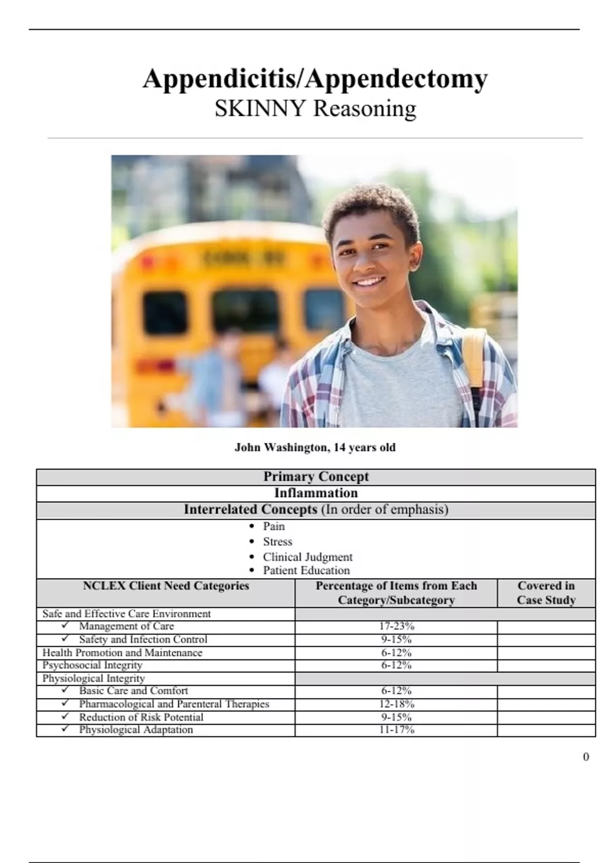 Appendicitis/Appendectomy SKINNY Reasoning John Washington, 14 years old Primary Concept Inflammation Interrelated Concepts (In order of emphasis) • Pain • Stress • Clinical Judgment • Patient Education NCLEX Client Need Categories Percentage of Items from Each Category/Subcategory Covered in Case Study Safe and Effective Care Environment Management of Care 17-23% Safety and Infection Control 9-15% Health Promotion and Maintenance 6-12% Psychosocial Integrity 6-12% Physiological Integrity Basic Care and Comfort 6-12% Pharmacological and Parenteral Therapies 12-18% Reduction of Risk Potential 9-15% Physiological Adaptation 11-17% SKINNY Reasoning Part I: Recognizing RELEVANT Clinical Data History of Present Problem: John Washington is a healthy 14-year-old African American male who weighs 150 lbs. (68.2 kg). He came to the emergency department because he woke up this morning at about 2 am with "excruciating" generalized abdominal pain around his belly button that has been progressively getting worse over the past several hours. It is now 2 pm. He took ibuprofen 400 mg PO this morning, which decreased the pain some but is now more painful and uncomfortable. The pain is now localized to his RLQ. The pain increases with walking and movement but he feels better when he lies down in a fetal position. He vomited three times after he drank some orange juice for breakfast this morning and has had nothing to drink since. He continues to feel nauseated but has not had an emesis since this morning. Personal/Social History: John lives with his mother and three younger brothers. He is active in athletics and has a strong social network of friends and family in the inner-city neighborhood where he lives. What data from the histories are RELEVANT and must be interpreted as clinically significant by the nurse? (Reduction of Risk Potential) RELEVANT Data from Present Problem: Clinical Significance: Woke by Acute abd. pain, progressively worse. Localized RLQ. Treated with 400 mpg Motrin Vomits x 3 Pain was sudden, not attributed to an MOI, localized to the area of the appendicitis. He attempted to treat with an anti inflammatory but it continues to progress. He is in a fetal position and cant maintain oral hydration . RELEVANT Data from Social History: Clinical Significance: Lives in the inner city, with single mother and 3 siblings. Plays sports nformation he has a single mother and 3 siblings. Receiving care needed maybe difficult due to resources and time. Patient Care Begins: Current VS: P-Q-R-S-T Pain Assessment: T: 100.5 F/38.1 C (oral) Provoking/Palliative: Movement, palpation P: 106 (regular) Quality: Sharp, cramping R: 20 (regular) Region/Radiation: Mid abdomen, RLQ BP: 142/76 Severity: 8/10 O2 sat: 99% RA Timing: Continuous What VS data are RELEVANT and must be interpreted as clinically significant by the nurse? (Reduction of Risk Potential/Health Promotion and Maintenance) RELEVANT VS Data: Clinical Significance: 100.5 Temp 106 H/R 20 R Pain assessment Raised temp: Potential infection Raised HR: tachycardia from pain, anxiety, infection Raised respiration: hyperventilating (watch SPO2), due to pain, anxiety Pain assessment details characteristics of his pain helping to identify underlying cause. Because his pain is sharp, continues, provokable, and located in the LQR it may be appendicitis