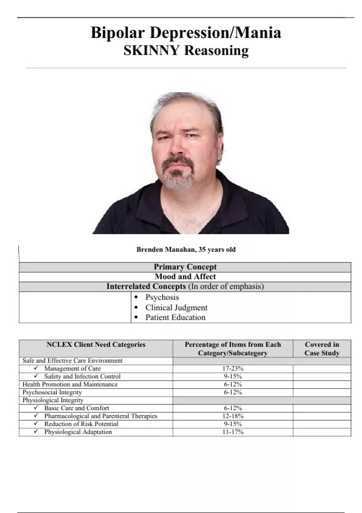 Bipolar Depression/Mania SKINNY Reasoning Brenden Manahan, 35 years old Primary Concept Mood and Affect Interrelated Concepts (In order of emphasis) • Psychosis • Clinical Judgment • Patient Education NCLEX Client Need Categories Percentage of Items from Each Category/Subcategory Covered in Case Study Safe and Effective Care Environment Management of Care 17-23% Safety and Infection Control 9-15% Health Promotion and Maintenance 6-12% Psychosocial Integrity 6-12% Physiological Integrity Basic Care and Comfort 6-12% Pharmacological and Parenteral Therapies 12-18% Reduction of Risk Potential 9-15% Physiological Adaptation 11-17% SKINNY Reasoning Part I: Recognizing RELEVANT Clinical Data History of Present Problem: Brenden Manahan is a 35-year-old male, who has been admitted to the crisis intervention unit for exacerbation of his bipolar disorder. He was admitted on a 501 (involuntary inpatient admission, patient has been deemed either dangerous to self or others) and brought to the hospital by police because his mother feared for his safety. In the past few weeks he stopped taking his medication because he feared that his mother was poisoning him. Brenden has not slept in the past four days due to racing thoughts. He believes that he is the head of the CIA and told his mother that he needed her car to go to CIA headquarters in McLean, Virginia, and fire everyone. When the police arrived they noted that Brenden was speaking at a very rapid rate and pace and was becoming increasingly agitated. He began yelling that the police where there to poison him and prevent him from returning to his job. He has been admitted to the locked mental health unit for evaluation of his mental capacity and stabilization. Brenden will participate in the following education groups: medication education, and bipolar illness education. The goal is to resume lithium carbonate and divalproex sodium. Personal/Social History: Brenden was diagnosed at 19 with bipolar I, and subsequently has been admitted six times due to non-adherence to the medication regimen. Brenden is divorced and has a 3-year-old son who lives with his mother. He was recently in court to have his visitations reduced to one supervised visit a week. He lives with his mother, who is supportive. What data from the histories is important and RELEVANT and has clinical significance for the nurse? RELEVANT Data from Present Problem: Clinical Significance: RELEVANT Data from Social History: Clinical Significance: Current VS: WILDA Pain Assessment (5th VS): T: 99.1 F/37.3 C (oral) Words: Patient denies P: 110 (regular) Intensity: R: 28 (regular) Location: BP: 142/84 Duration: O2 sat: 99% room air Aggravate: Alleviate: Patient Care Begins: What VS data are RELEVANT and must be recognized as clinically significant by the nurse? RELEVANT VS Data: Clinical Significance: