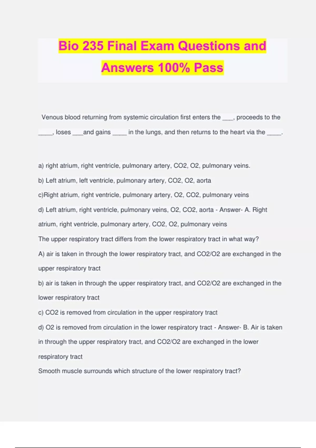 Bio 235 Final Exam Questions and Answers 100% Pass Venous blood returning from systemic circulation first enters the ___, proceeds to the ____, loses ___and gains ____ in the lungs, and then returns to the heart via the ____. a) right atrium, right ventricle, pulmonary artery, CO2, O2, pulmonary veins. b) Left atrium, left ventricle, pulmonary artery, CO2, O2, aorta c)Right atrium, right ventricle, pulmonary artery, O2, CO2, pulmonary veins d) Left atrium, right ventricle, pulmonary veins, O2, CO2, aorta - Answer- A. Right atrium, right ventricle, pulmonary artery, CO2, O2, pulmonary veins The upper respiratory tract differs from the lower respiratory tract in what way? A) air is taken in through the lower respiratory tract, and CO2/O2 are exchanged in the upper respiratory tract b) air is taken in through the upper respiratory tract, and CO2/O2 are exchanged in the lower respiratory tract c) CO2 is removed from circulation in the upper respiratory tract d) O2 is removed from circulation in the lower respiratory tract - Answer- B. Air is taken in through the upper respiratory tract, and CO2/O2 are exchanged in the lower respiratory tract Smooth muscle surrounds which structure of the lower respiratory tract? a) Alveoli b) Alveolar capillaries c) Terminal bronchioles d) Trachea - Answer- C. terminal bronchioles In the alveolus, ____squamous epithelial cells are responsible for ___, while ___cells are responsible for ____. a) Type 1; surfactant secretion; Type 2, gas exchange b) type 1; debris removal; type 2; surfactant secretion c) type 3; debris removal; type 1; gas exchange d) type 1; gas exchange; type 2: surfactant secretion - Answer- d) type 1; gas exchange; type 2: surfactant secretion There is no net air flow into or out of the lungs when a) P alveolus = P atmostpher b) P alveolus< P atmostphere c) P pleural wall > P atmostphere d) P atmosphere< P pleural wall - Answer- a) P alveolus = P atmosphere What keeps the lungs from collapsing Check the - Answer- b) trans pulmonary negative pressure caused by negative pressure from pleural cavity Identify the correct sequence of events for inspiration a) diaphragm & inspiratory intercostals relax, lungs expand, air flows into alveoli b) diaphragm & inspiratory intercostals contract; lungs expand, air flows out of the alveoli c) diaphragm & inspiratory intercostals contract, lungs expand, air flows into alveoli d)diaphragm & expiratory intercostals relax, lungs contract, air flows out of alveoli - Answer- c) diaphragm & inspiratory intercostals contract, lungs expand, air flows into alveoli the main determiners of lung compliance are a) lung tissue thickness, surface tension of fluid on the inner lung surface b) lung tissue perforations, surface tension of fluid on the inner lung surface c) lung tissue surface area, surface tension of fluid on the inner lung surface d) lung tissue thickness, surface tension of fluid on the outer lung surface - Answer- a) lung tissue thickness, surface tension of fluid on the inner lung surface lung compliance is defined as a) lung volume/ transpulmonary pressure b) transpulmonary pressure/ lung volume c) transthoracic pressure/ atmospheric pressure d) none of the above - Answer- d) none of the above trained athletes tend to have a) increased lung compliance b) normal lung compliance c) decreased lung compliance d) asthma - Answer- a) increased lung compliance which is true abbout the pleural sac