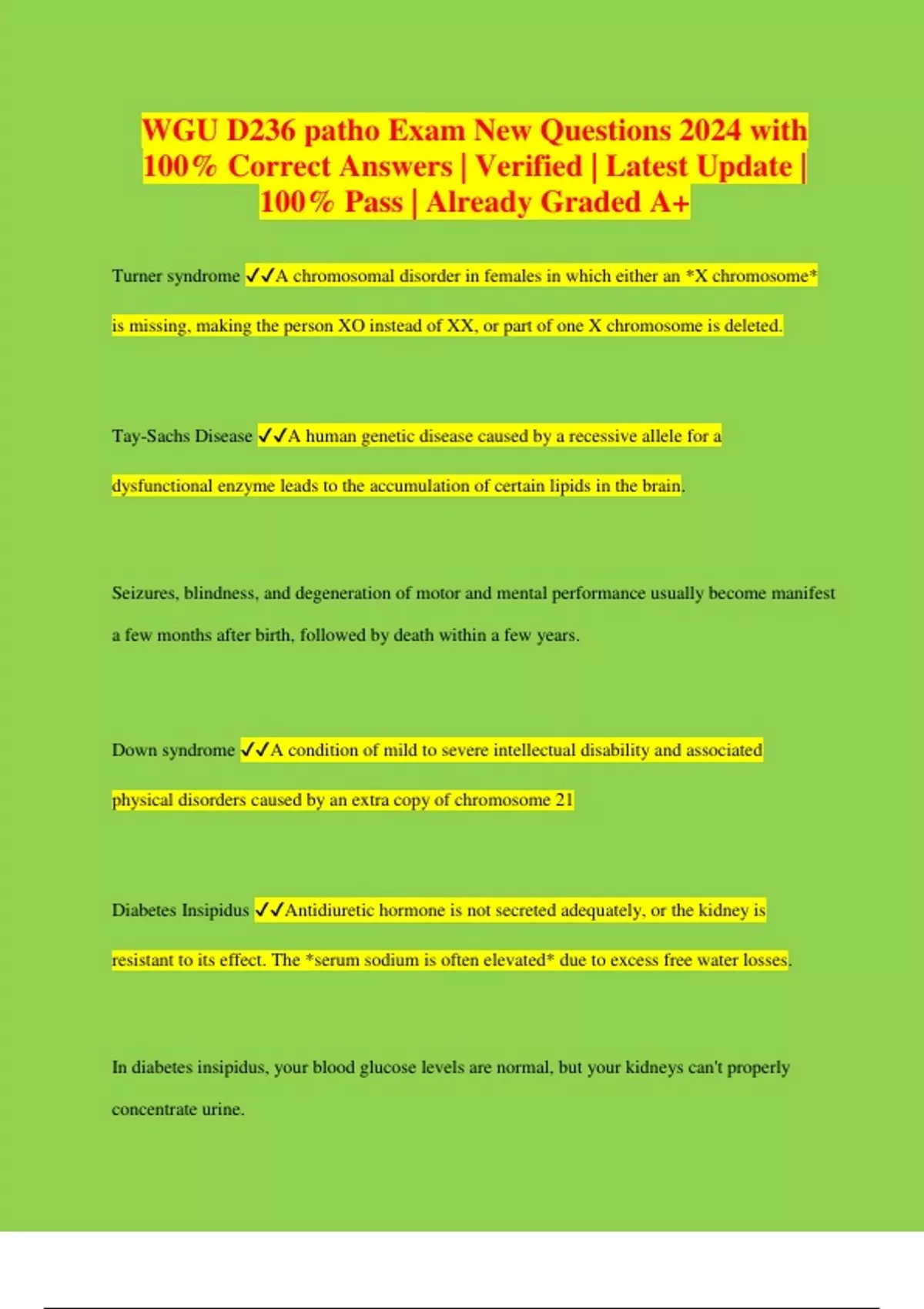 WGU D236 patho Exam New Questions 2024 with 100% Correct Answers | Verified | Latest Update | 100% Pass | Already Graded A+ Turner syndrome A chromosomal disorder in females in which either an *X chromosome* is missing, making the person XO instead of XX, or part of one X chromosome is deleted. Tay-Sachs Disease A human genetic disease caused by a recessive allele for a dysfunctional enzyme leads to the accumulation of certain lipids in the brain. Seizures, blindness, and degeneration of motor and mental performance usually become manifest a few months after birth, followed by death within a few years. Down syndrome A condition of mild to severe intellectual disability and associated physical disorders caused by an extra copy of chromosome 21 Diabetes Insipidus Antidiuretic hormone is not secreted adequately, or the kidney is resistant to its effect. The *serum sodium is often elevated* due to excess free water losses. In diabetes insipidus, your blood glucose levels are normal, but your kidneys can't properly concentrate urine. Cardiac Valve Disease Process In heart valve disease, one or more of the valves in your heart doesn't work properly. Regurgitation (or leakage of the valve). When the valve(s) do not close completely, it causes blood to flow backward through the valve. This reduces forward blood flow and can lead to volume overload in the heart. Stenosis (or narrowing of the valve). When the valve(s) opening becomes narrowed, it limits the flow of blood out of the ventricles or atria. The heart is forced to pump blood with increased force to move blood through the narrowed or stiff (stenotic) valve(s). Cardiac Valve Complications Heart valve disease can cause many complications, including: * Heart failure. * Stroke. * Blood clots. * Heart rhythm abnormalities. * Death.