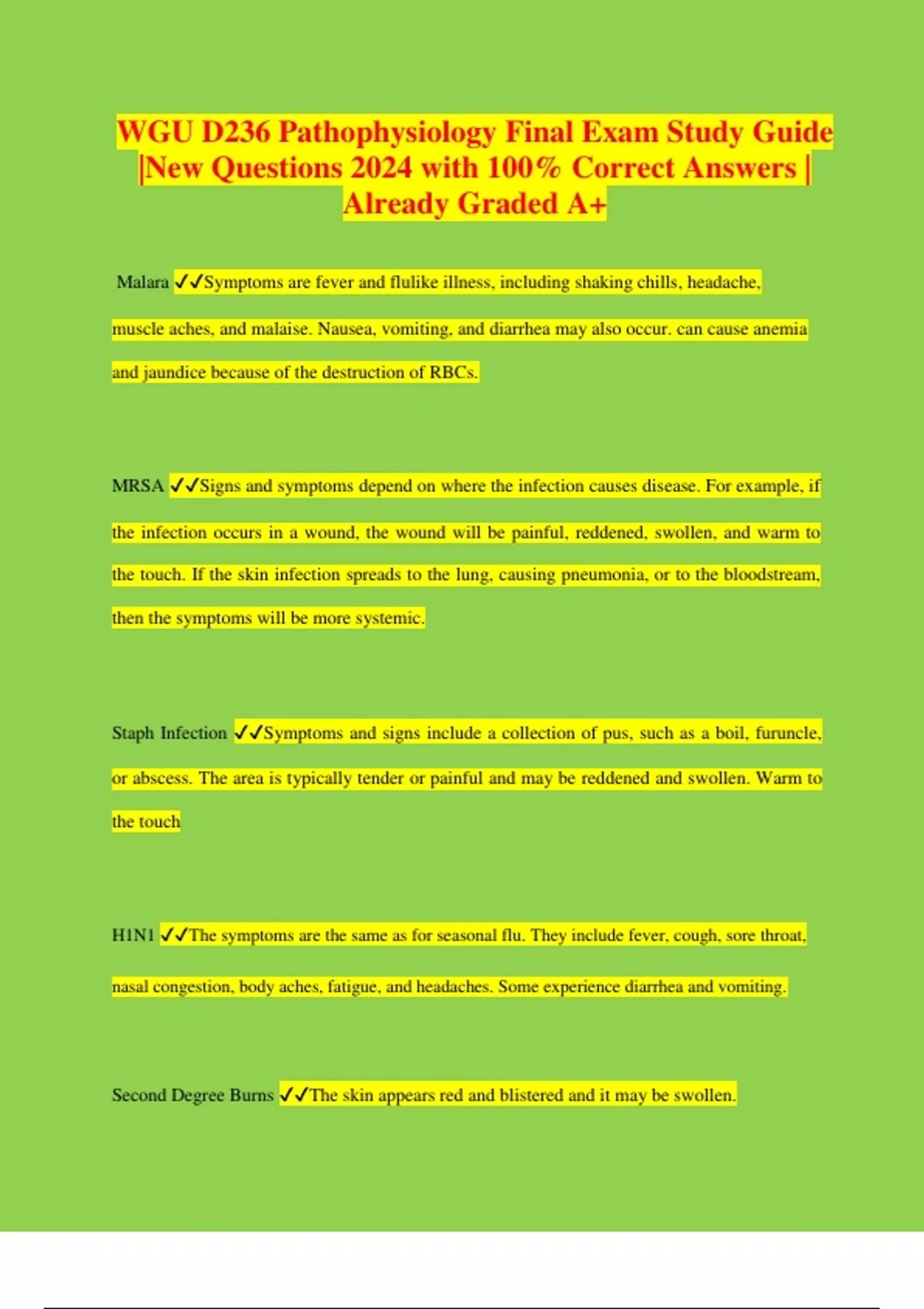 WGU D236 Pathophysiology Final Exam Study Guide |New Questions 2024 with 100% Correct Answers | Already Graded A+ Malara Symptoms are fever and flulike illness, including shaking chills, headache, muscle aches, and malaise. Nausea, vomiting, and diarrhea may also occur. can cause anemia and jaundice because of the destruction of RBCs. MRSA Signs and symptoms depend on where the infection causes disease. For example, if the infection occurs in a wound, the wound will be painful, reddened, swollen, and warm to the touch. If the skin infection spreads to the lung, causing pneumonia, or to the bloodstream, then the symptoms will be more systemic. Staph Infection Symptoms and signs include a collection of pus, such as a boil, furuncle, or abscess. The area is typically tender or painful and may be reddened and swollen. Warm to the touch H1N1 The symptoms are the same as for seasonal flu. They include fever, cough, sore throat, nasal congestion, body aches, fatigue, and headaches. Some experience diarrhea and vomiting. Second Degree Burns The skin appears red and blistered and it may be swollen. First Degree Burns The skin is red, painful, and dry, but there are no blisters. Third Degree Burns The skin most likely appears white, pearly, or leathery. Fourth Degree Burns Extends into underlying bones, muscles, tendons, nerves, and blood vessels. The skin appears white or charred; sensation is lost because nerve endings are destroyed. Near drowning The person generally aspirates fluid or may have an obstructed airway caused by a spasm of the larynx when gasping underwater, resulting in hypoxemia (insufficient oxygenation of the arterial blood). Later, within minutes or possibly days, the person may experience respiratory distress.