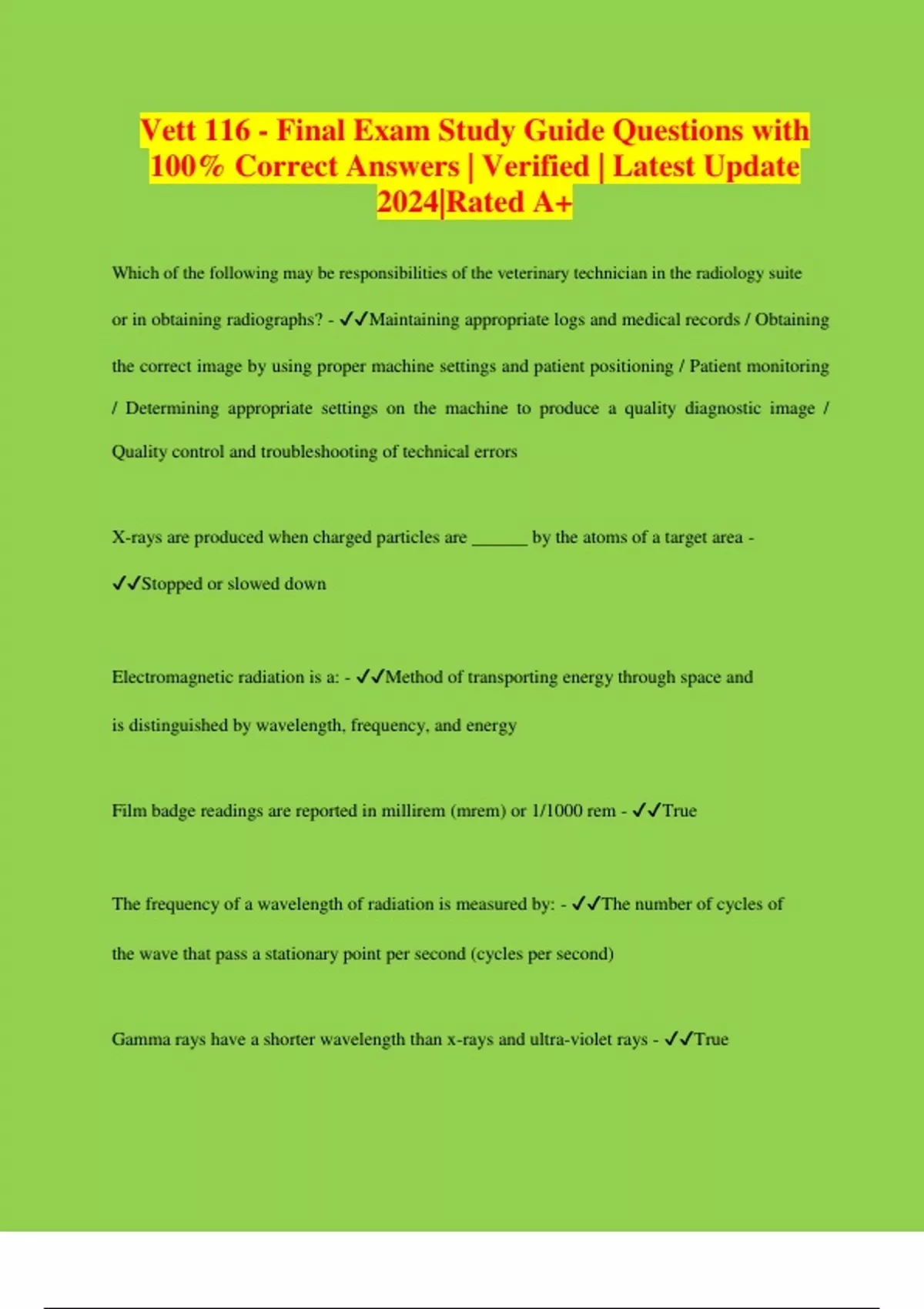 Vett 116 - Final Exam Study Guide Questions with 100% Correct Answers | Verified | Latest Update 2024|Rated A+ Which of the following may be responsibilities of the veterinary technician in the radiology suite or in obtaining radiographs? - Maintaining appropriate logs and medical records / Obtaining the correct image by using proper machine settings and patient positioning / Patient monitoring / Determining appropriate settings on the machine to produce a quality diagnostic image / Quality control and troubleshooting of technical errors X-rays are produced when charged particles are ______ by the atoms of a target area - Stopped or slowed down Electromagnetic radiation is a: - Method of transporting energy through space and is distinguished by wavelength, frequency, and energy Film badge readings are reported in millirem (mrem) or 1/1000 rem - True The frequency of a wavelength of radiation is measured by: - The number of cycles of the wave that pass a stationary point per second (cycles per second) Gamma rays have a shorter wavelength than x-rays and ultra-violet rays - True Electrons travel: - Around the nucleus in orbits called shells The number of cycles of of the wave that pass a stationary point in a second defines: - Frequency