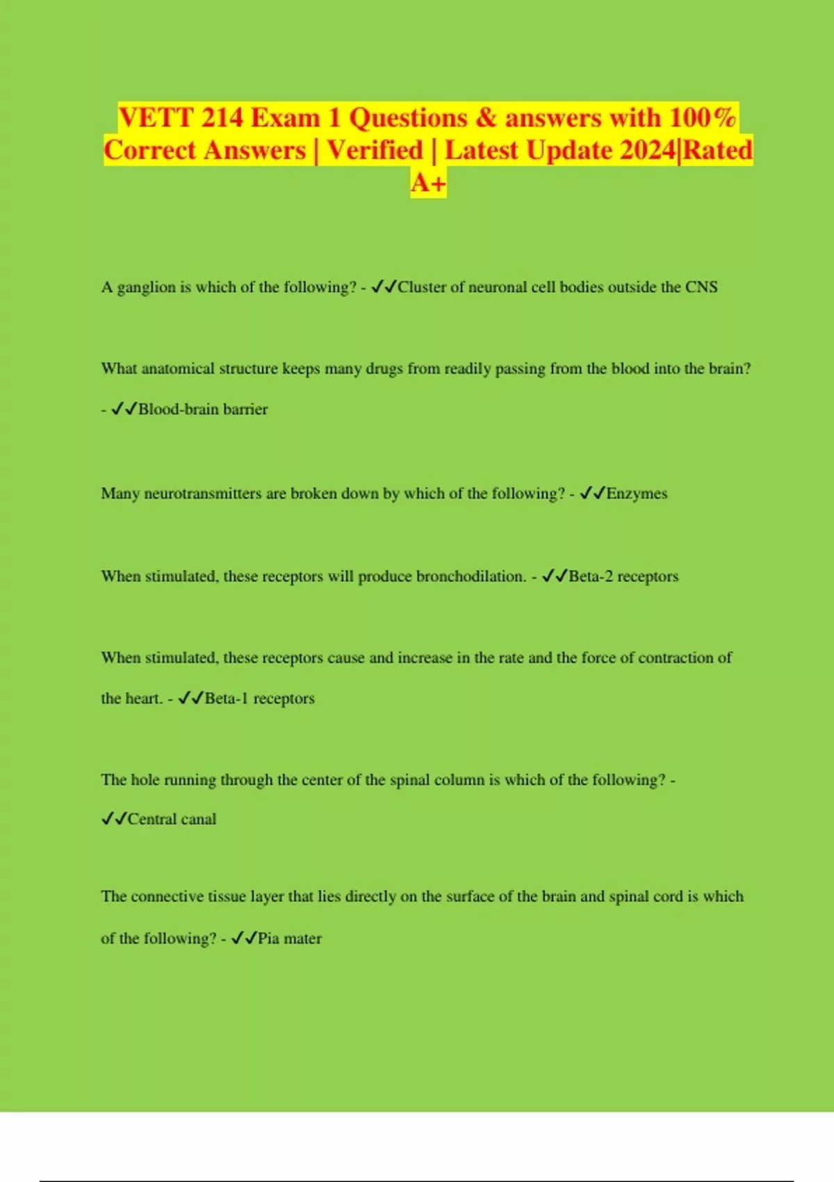 VETT 214 Exam 1 Questions & answers with 100% Correct Answers | Verified | Latest Update 2024|Rated A+ A ganglion is which of the following? - Cluster of neuronal cell bodies outside the CNS What anatomical structure keeps many drugs from readily passing from the blood into the brain? - Blood-brain barrier Many neurotransmitters are broken down by which of the following? - Enzymes When stimulated, these receptors will produce bronchodilation. - Beta-2 receptors When stimulated, these receptors cause and increase in the rate and the force of contraction of the heart. - Beta-1 receptors The hole running through the center of the spinal column is which of the following? - Central canal The connective tissue layer that lies directly on the surface of the brain and spinal cord is which of the following? - Pia mater A somatic reflex involves which of the following? - Skeletal muscle contraction Which of the following chemicals is the neurotransmitter for the preganglionic sympathetic nervous system? - Acetylcholine