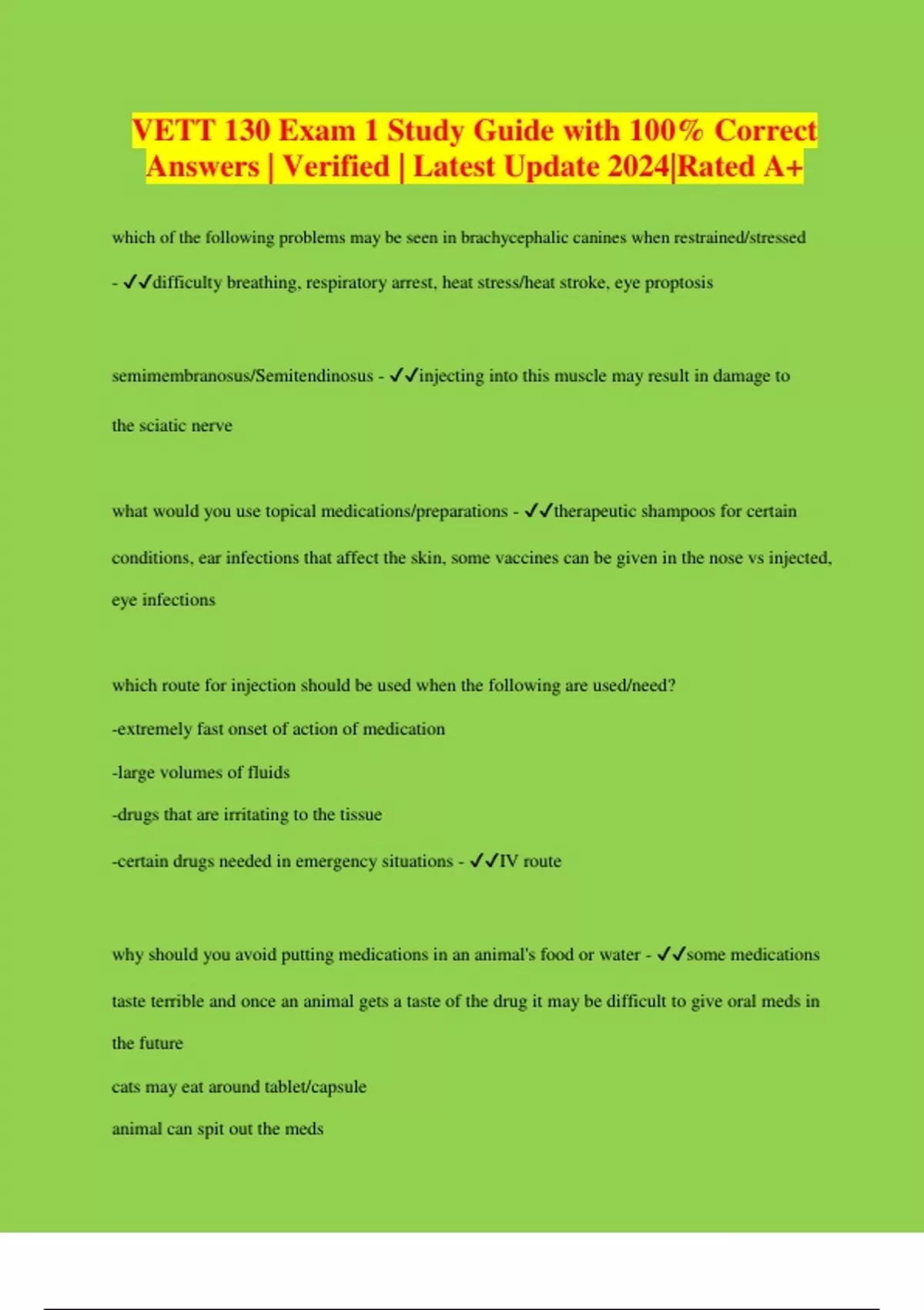 VETT 130 Exam 1 Study Guide with 100% Correct Answers | Verified | Latest Update 2024|Rated A+ which of the following problems may be seen in brachycephalic canines when restrained/stressed - difficulty breathing, respiratory arrest, heat stress/heat stroke, eye proptosis semimembranosus/Semitendinosus - injecting into this muscle may result in damage to the sciatic nerve what would you use topical medications/preparations - therapeutic shampoos for certain conditions, ear infections that affect the skin, some vaccines can be given in the nose vs injected, eye infections which route for injection should be used when the following are used/need? -extremely fast onset of action of medication -large volumes of fluids -drugs that are irritating to the tissue -certain drugs needed in emergency situations - IV route why should you avoid putting medications in an animal's food or water - some medications taste terrible and once an animal gets a taste of the drug it may be difficult to give oral meds in the future cats may eat around tablet/capsule animal can spit out the meds which of the following parameters should always be monitored during restraint of a patient - -gum color/crt -respiratory rate -patient behavior -heart rate/rhythm