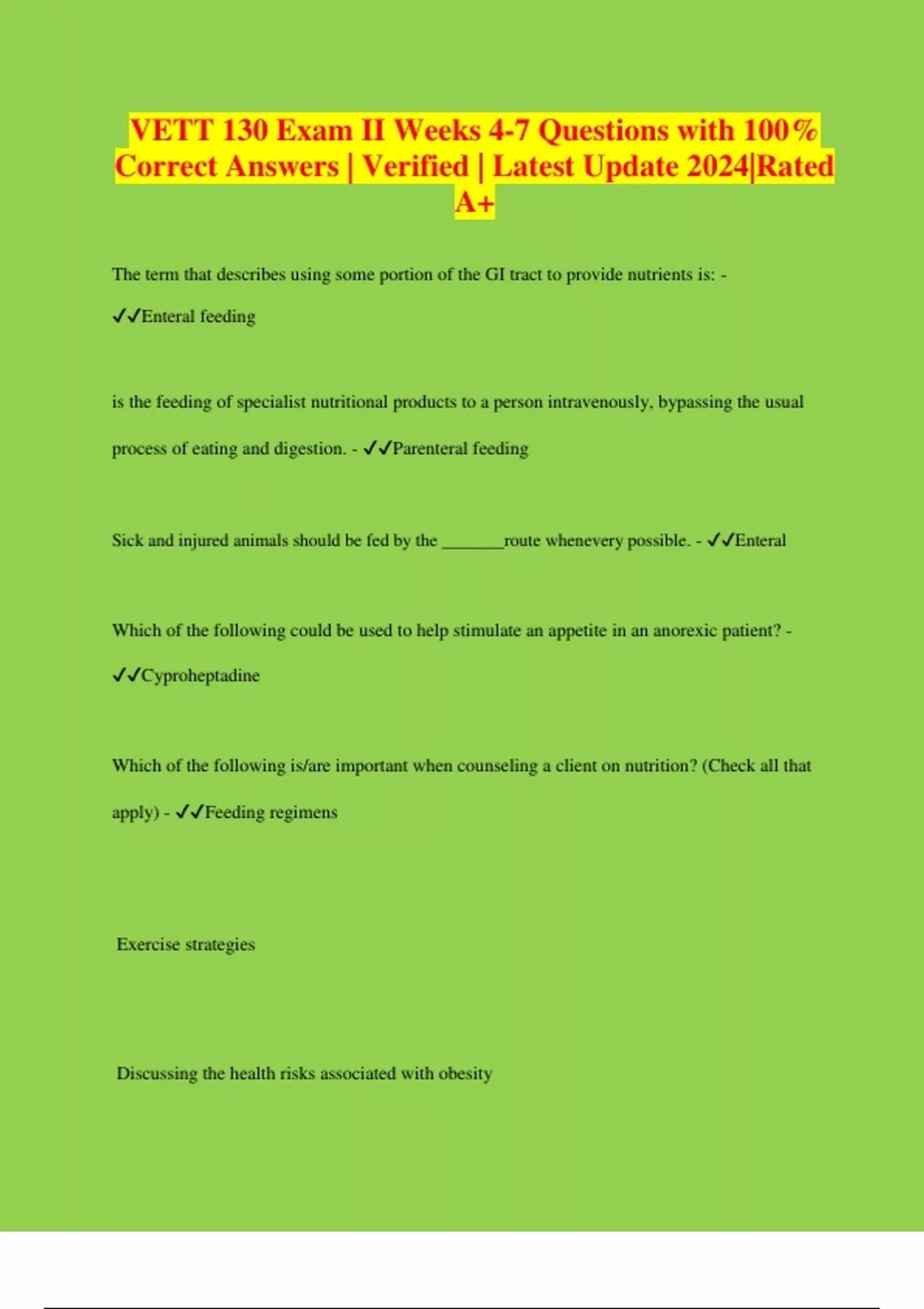 VETT 130 Exam II Weeks 4-7 Questions with 100% Correct Answers | Verified | Latest Update 2024|Rated A+ The term that describes using some portion of the GI tract to provide nutrients is: - Enteral feeding is the feeding of specialist nutritional products to a person intravenously, bypassing the usual process of eating and digestion. - Parenteral feeding Sick and injured animals should be fed by the _______route whenevery possible. - Enteral Which of the following could be used to help stimulate an appetite in an anorexic patient? - Cyproheptadine Which of the following is/are important when counseling a client on nutrition? (Check all that apply) - Feeding regimens Exercise strategies Discussing the health risks associated with obesity Routine weighing and record keeping BCS The term that means lack or loss of appetite is: - Anorexia