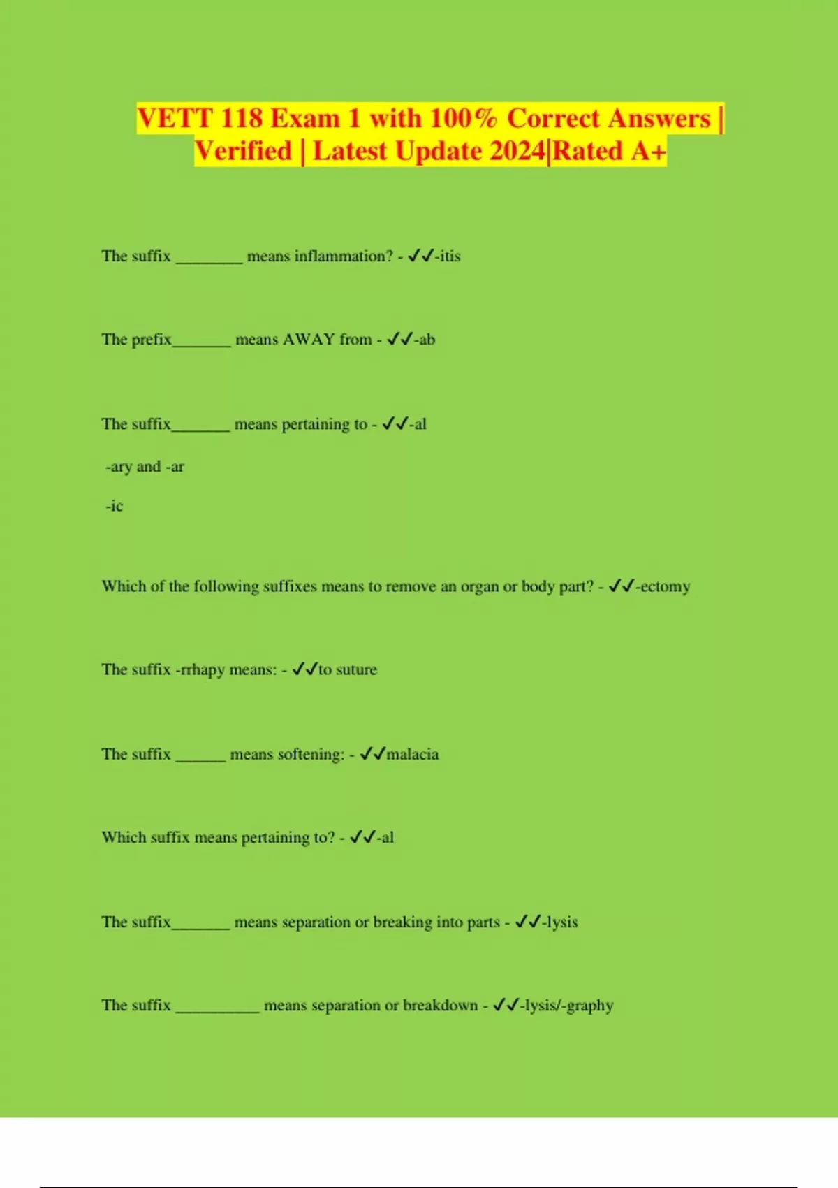 VETT 118 Exam 1 with 100% Correct Answers | Verified | Latest Update 2024|Rated A+ The suffix ________ means inflammation? - -itis The prefix_______ means AWAY from - -ab The suffix_______ means pertaining to - -al -ary and -ar -ic Which of the following suffixes means to remove an organ or body part? - -ectomy The suffix -rrhapy means: - to suture The suffix ______ means softening: - malacia Which suffix means pertaining to? - -al The suffix_______ means separation or breaking into parts - -lysis The suffix __________ means separation or breakdown - -lysis/-graphy The suffix _________ means disease? - -pathy The suffix -um means: - structure The prefix that means difficult, painful, or bad is: - dys-