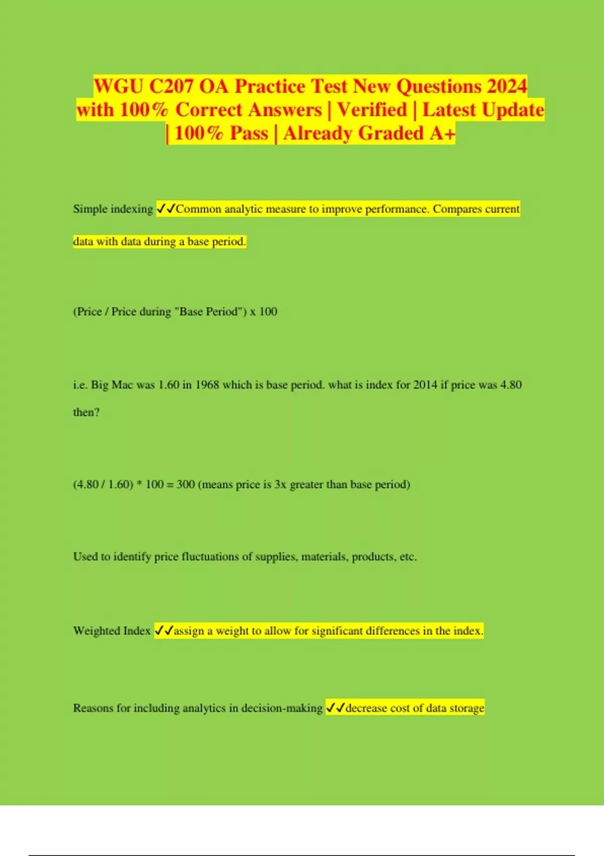 WGU C207 OA Practice Test New Questions 2024 with 100% Correct Answers | Verified | Latest Update | 100% Pass | Already Graded A+ Simple indexing Common analytic measure to improve performance. Compares current data with data during a base period. (Price / Price during "Base Period") x 100 i.e. Big Mac was 1.60 in 1968 which is base period. what is index for 2014 if price was 4.80 then? (4.80 / 1.60) * 100 = 300 (means price is 3x greater than base period) Used to identify price fluctuations of supplies, materials, products, etc. Weighted Index assign a weight to allow for significant differences in the index. Reasons for including analytics in decision-making decrease cost of data storage increase processing power Descriptive Analytics using current and past data for strictly descriptive purposes. i.e. car price data shows a 2% increase over the prior year a manager wants to know why sales spiked during the prior quarter Predictive / Inferential Analytics using current and past data to predict/estimate future. i.e. based on the past 10 years of data for car prices, we predict an increase of 1.5% over the upcoming year. Prescriptive Analytics using past data to PREDICT or ESTIMATE future in order to optimize operations