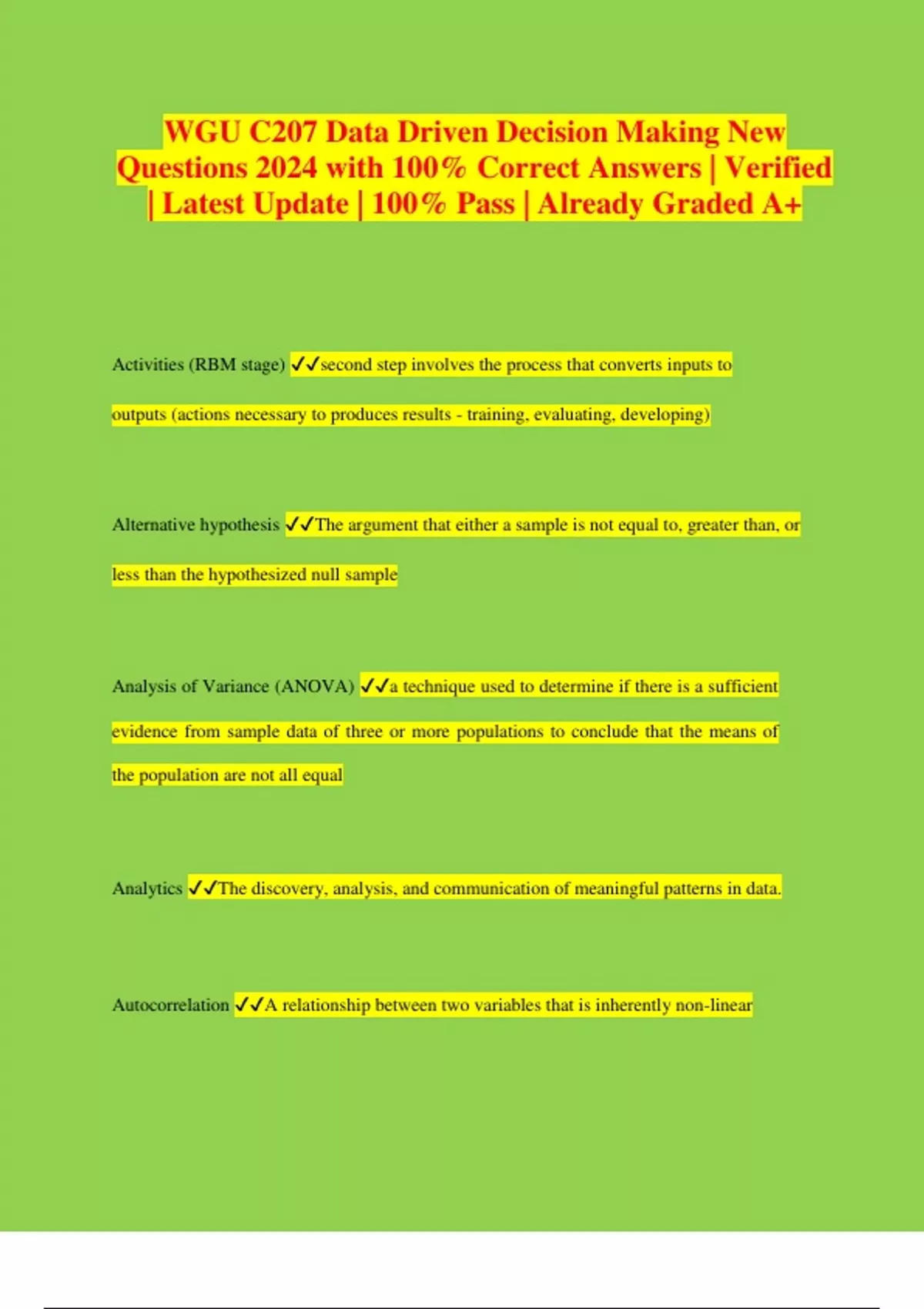 WGU C207 Data Driven Decision Making New Questions 2024 with 100% Correct Answers | Verified | Latest Update | 100% Pass | Already Graded A+