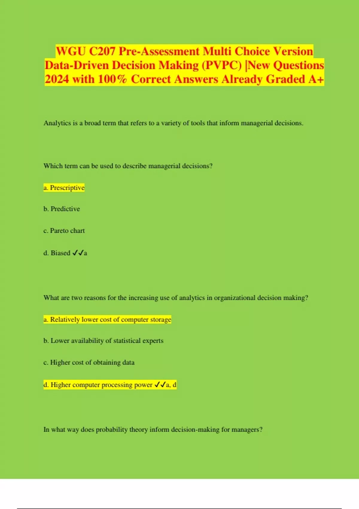 WGU C207 Pre-Assessment Multi Choice Version Data-Driven Decision Making (PVPC) |New Questions 2024 with 100% Correct Answers Already Graded A+ Analytics is a broad term that refers to a variety of tools that inform managerial decisions. Which term can be used to describe managerial decisions? a. Prescriptive b. Predictive c. Pareto chart d. Biased a What are two reasons for the increasing use of analytics in organizational decision making? a. Relatively lower cost of computer storage b. Lower availability of statistical experts c. Higher cost of obtaining data d. Higher computer processing power a, d In what way does probability theory inform decision-making for managers? a. By quantifying risk b. By quantifying data c. By quantifying quality d. By quantifying costs a Which type of data are the Olympic medals of gold, silver, and bronze examples of? a. Nominal data b. Ordinal data c. Interval data d. Ratio data b What are two aspects of data quality management? a. It calculates spurious data. b. It reduces the amount of incomplete data. c. It monitors data input rates. d. It cleans data. b, d