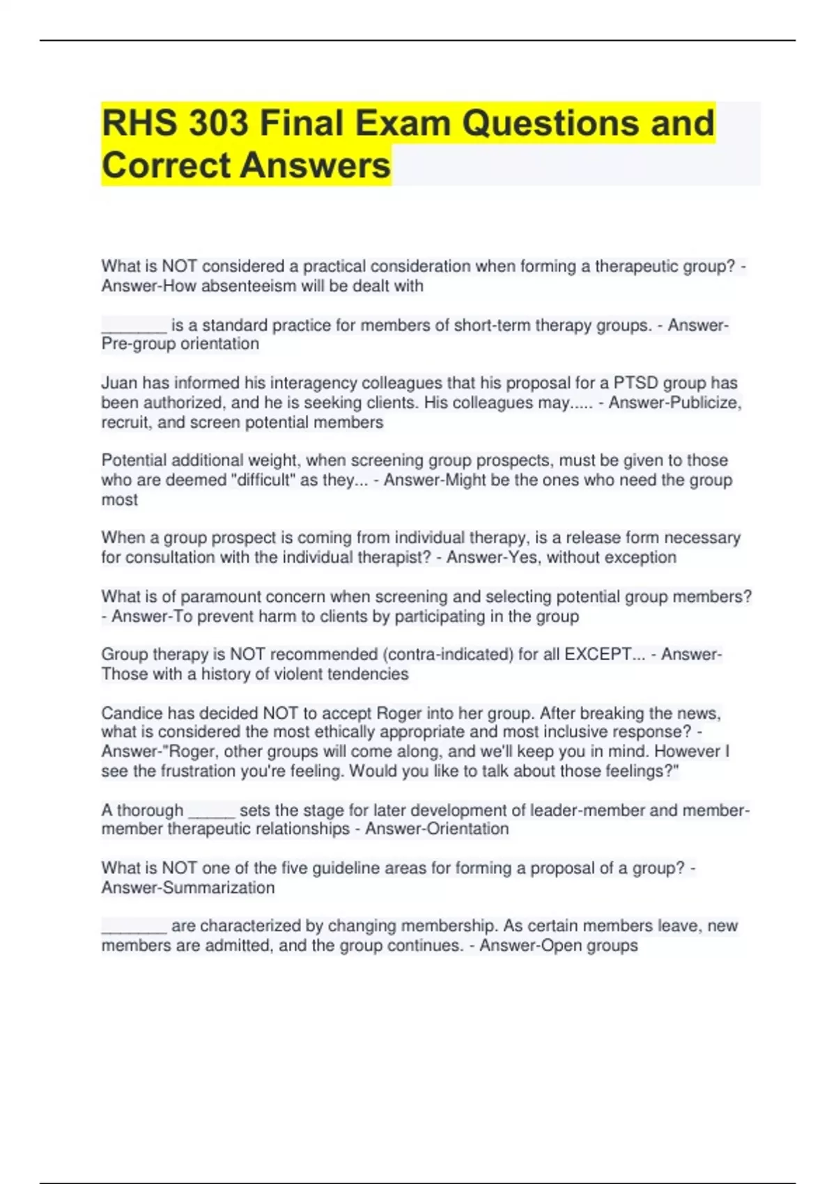 RHS 303 Final Exam Questions and Correct Answers What is NOT considered a practical consideration when forming a therapeutic group? - Answer-How absenteeism will be dealt with _______ is a standard practice for members of short-term therapy groups. - AnswerPre-group orientation Juan has informed his interagency colleagues that his proposal for a PTSD group has been authorized, and he is seeking clients. His colleagues may..... - Answer-Publicize, recruit, and screen potential members Potential additional weight, when screening group prospects, must be given to those who are deemed "difficult" as they... - Answer-Might be the ones who need the group most When a group prospect is coming from individual therapy, is a release form necessary for consultation with the individual therapist? - Answer-Yes, without exception What is of paramount concern when screening and selecting potential group members? - Answer-To prevent harm to clients by participating in the group Group therapy is NOT recommended (contra-indicated) for all EXCEPT... - AnswerThose with a history of violent tendencies Candice has decided NOT to accept Roger into her group. After breaking the news, what is considered the most ethically appropriate and most inclusive response? - Answer-"Roger, other groups will come along, and we'll keep you in mind. However I see the frustration you're feeling. Would you like to talk about those feelings?" A thorough _____ sets the stage for later development of leader-member and membermember therapeutic relationships - Answer-Orientation What is NOT one of the five guideline areas for forming a proposal of a group? - Answer-Summarization _______ are characterized by changing membership. As certain members leave, new members are admitted, and the group continues. - Answer-Open groups _______ typically have some time limitations, with the group meeting for a predetermined number of sessions - Answer-Closed groups