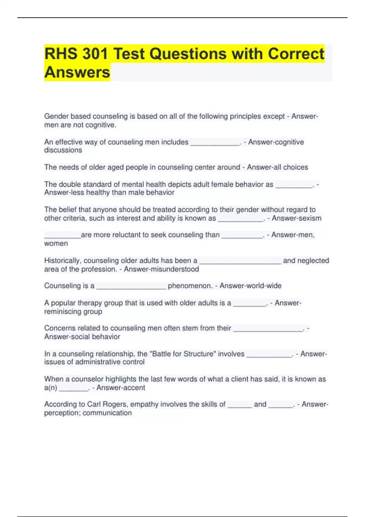 RHS 301 Test Questions with Correct Answers Gender based counseling is based on all of the following principles except - Answermen are not cognitive. An effective way of counseling men includes ____________. - Answer-cognitive discussions The needs of older aged people in counseling center around - Answer-all choices The double standard of mental health depicts adult female behavior as _________. - Answer-less healthy than male behavior The belief that anyone should be treated according to their gender without regard to other criteria, such as interest and ability is known as ___________. - Answer-sexism _________are more reluctant to seek counseling than __________. - Answer-men, women Historically, counseling older adults has been a ____________________ and neglected area of the profession. - Answer-misunderstood Counseling is a _________________ phenomenon. - Answer-world-wide A popular therapy group that is used with older adults is a ________. - Answerreminiscing group Concerns related to counseling men often stem from their _________________. - Answer-social behavior In a counseling relationship, the "Battle for Structure" involves ___________. - Answerissues of administrative control When a counselor highlights the last few words of what a client has said, it is known as a(n) _______. - Answer-accent