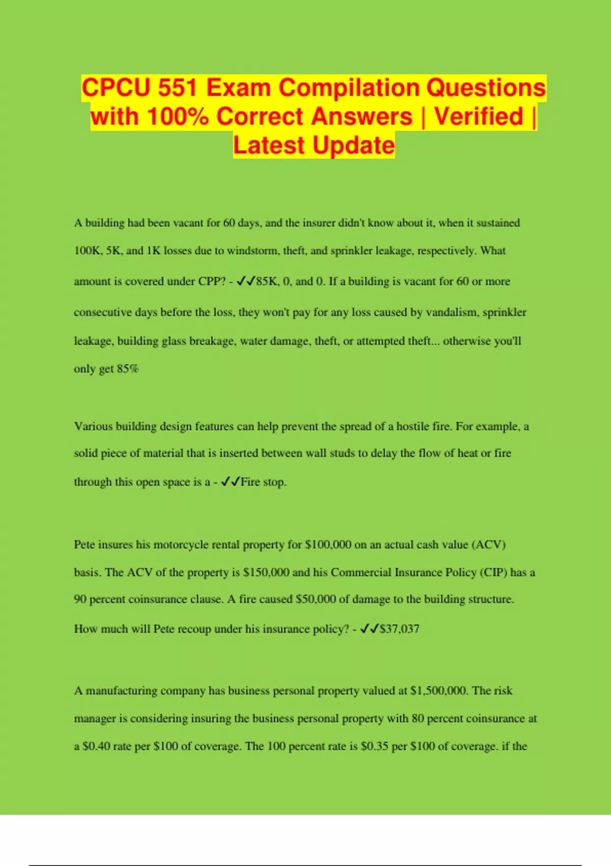 CPCU 551 Exam Compilation Questions with 100% Correct Answers | Verified | Latest Update A building had been vacant for 60 days, and the insurer didn't know about it, when it sustained 100K, 5K, and 1K losses due to windstorm, theft, and sprinkler leakage, respectively. What amount is covered under CPP? - 85K, 0, and 0. If a building is vacant for 60 or more consecutive days before the loss, they won't pay for any loss caused by vandalism, sprinkler leakage, building glass breakage, water damage, theft, or attempted theft... otherwise you'll only get 85% Various building design features can help prevent the spread of a hostile fire. For example, a solid piece of material that is inserted between wall studs to delay the flow of heat or fire through this open space is a - Fire stop. Pete insures his motorcycle rental property for $100,000 on an actual cash value (ACV) basis. The ACV of the property is $150,000 and his Commercial Insurance Policy (CIP) has a 90 percent coinsurance clause. A fire caused $50,000 of damage to the building structure. How much will Pete recoup under his insurance policy? - $37,037 A manufacturing company has business personal property valued at $1,500,000. The risk manager is considering insuring the business personal property with 80 percent coinsurance at a $0.40 rate per $100 of coverage. The 100 percent rate is $0.35 per $100 of coverage. if the business personal property is insured with an 80 percent coinsurance, how much premium will be saved? - The savings will be $5,250 − $4,800 = $450 When (if) can an insurer examine their insured's books and records? - Anytime during the policy period and up to 3 years after. The final premium is established after the policy period expires. Premiums are estimated at its formation. Can an insured transfer duties under common policy conditions? - Only with the insurer's written consent.