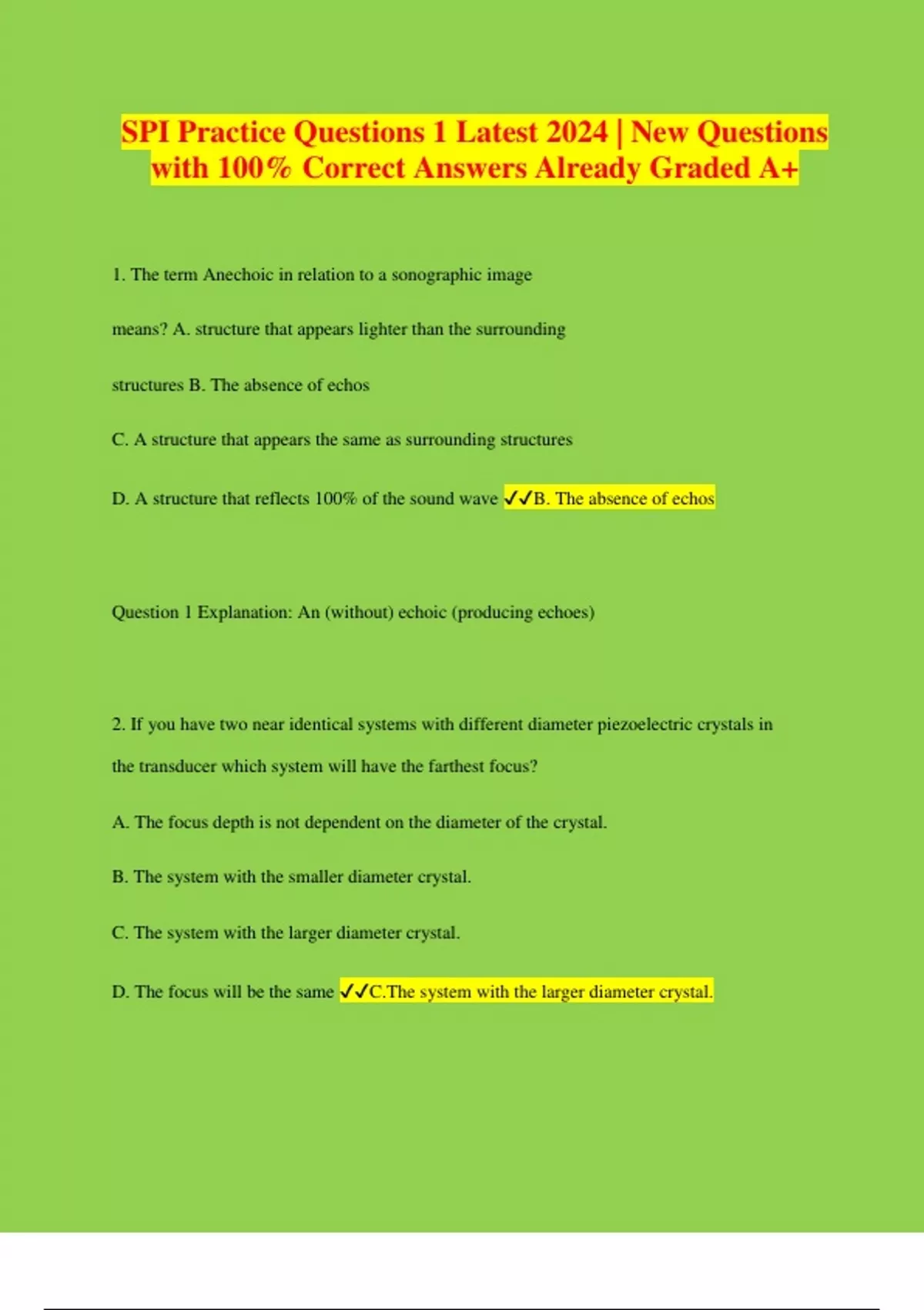 SPI Practice Questions 1 Latest 2024 | New Questions with 100% Correct Answers Already Graded A+ 1. The term Anechoic in relation to a sonographic image means? A. structure that appears lighter than the surrounding structures B. The absence of echos C. A structure that appears the same as surrounding structures D. A structure that reflects 100% of the sound wave B. The absence of echos Question 1 Explanation: An (without) echoic (producing echoes) 2. If you have two near identical systems with different diameter piezoelectric crystals in the transducer which system will have the farthest focus? A. The focus depth is not dependent on the diameter of the crystal. B. The system with the smaller diameter crystal. C. The system with the larger diameter crystal. D. The focus will be the same C.The system with the larger diameter crystal. 3. What is the upper limit intensity for the SPTA of a focused ultrasound wave with no observed bio-effects? A. 1 W/cm2 B. 10 W/cm2 C. 100 mW/cm2 D. 1 mW/cm2 A. 1 W/cm2 Question 3 Explanation: Bioeffects intensity limit: SPTA >100 mW/cm2 Unfocused >1 W/cm2 or 1000 mW/cm2 Focused Exam duration has the greatest effect on patient exposure. HIGHEST output intensities used with pulsed doppler. Lowest output intensities are with gray-scale imaging. 4. Brightness of the display is affected by? A. Dynamic Range B. Contrast C. Receiver amplification D. Echo length C. Receiver amplification