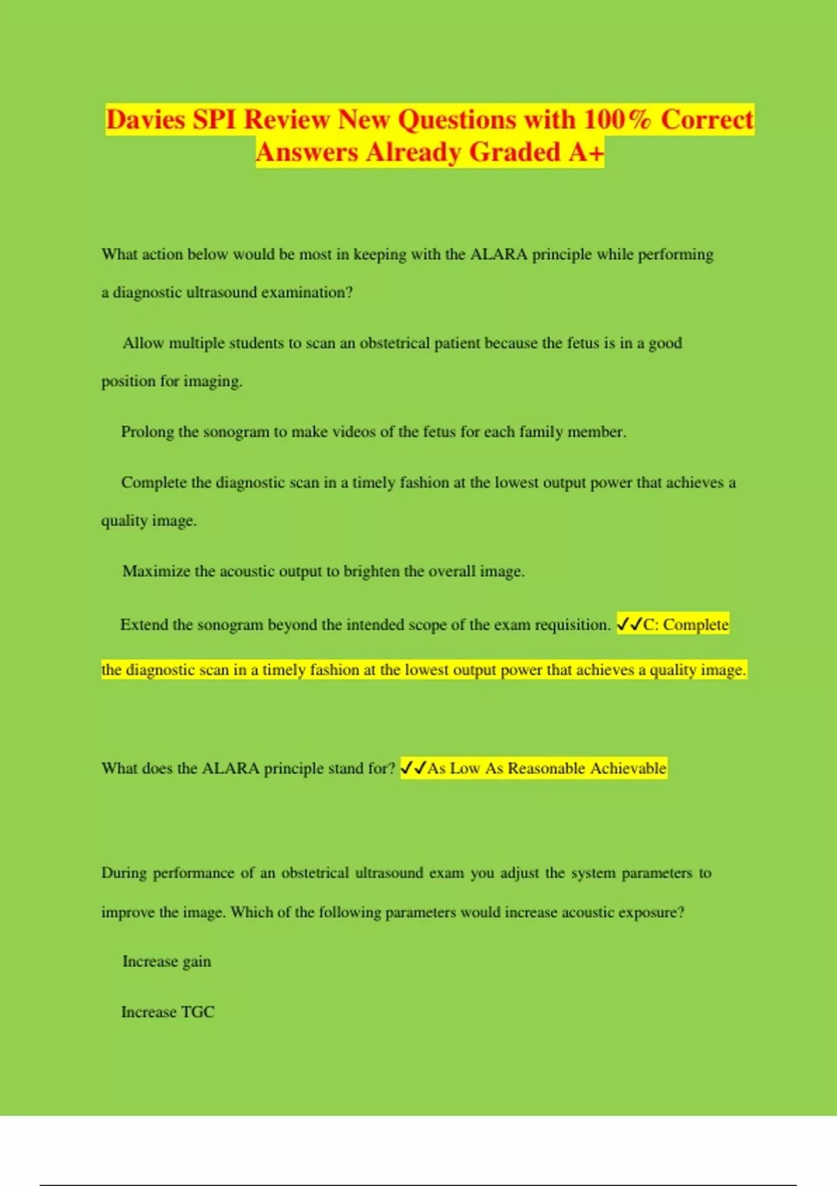 Davies SPI Review New Questions with 100% Correct Answers Already Graded A+ What action below would be most in keeping with the ALARA principle while performing a diagnostic ultrasound examination? Allow multiple students to scan an obstetrical patient because the fetus is in a good position for imaging. Prolong the sonogram to make videos of the fetus for each family member. Complete the diagnostic scan in a timely fashion at the lowest output power that achieves a quality image. Maximize the acoustic output to brighten the overall image. Extend the sonogram beyond the intended scope of the exam requisition. C: Complete the diagnostic scan in a timely fashion at the lowest output power that achieves a quality image. What does the ALARA principle stand for? As Low As Reasonable Achievable During performance of an obstetrical ultrasound exam you adjust the system parameters to improve the image. Which of the following parameters would increase acoustic exposure? Increase gain Increase TGC Increase frequency Increase transmit power Increase frame averaging D: Increase transmit power While performing a sonogram to minimize risk to the fetus which imaging mode trade off would be most applicable? Use M-mode instead of pulsed-wave Doppler to measure the fetal heart rate. Use color Doppler instead of power Doppler to image the umbilical cord. Use pulsed-wave Doppler instead of power Doppler to evaluate the fetal heart. Use harmonics instead of fundamental to image the fetal spine. All of the above. A: Use M-mode instead of pulsed-wave Doppler to measure the fetal heart rate.