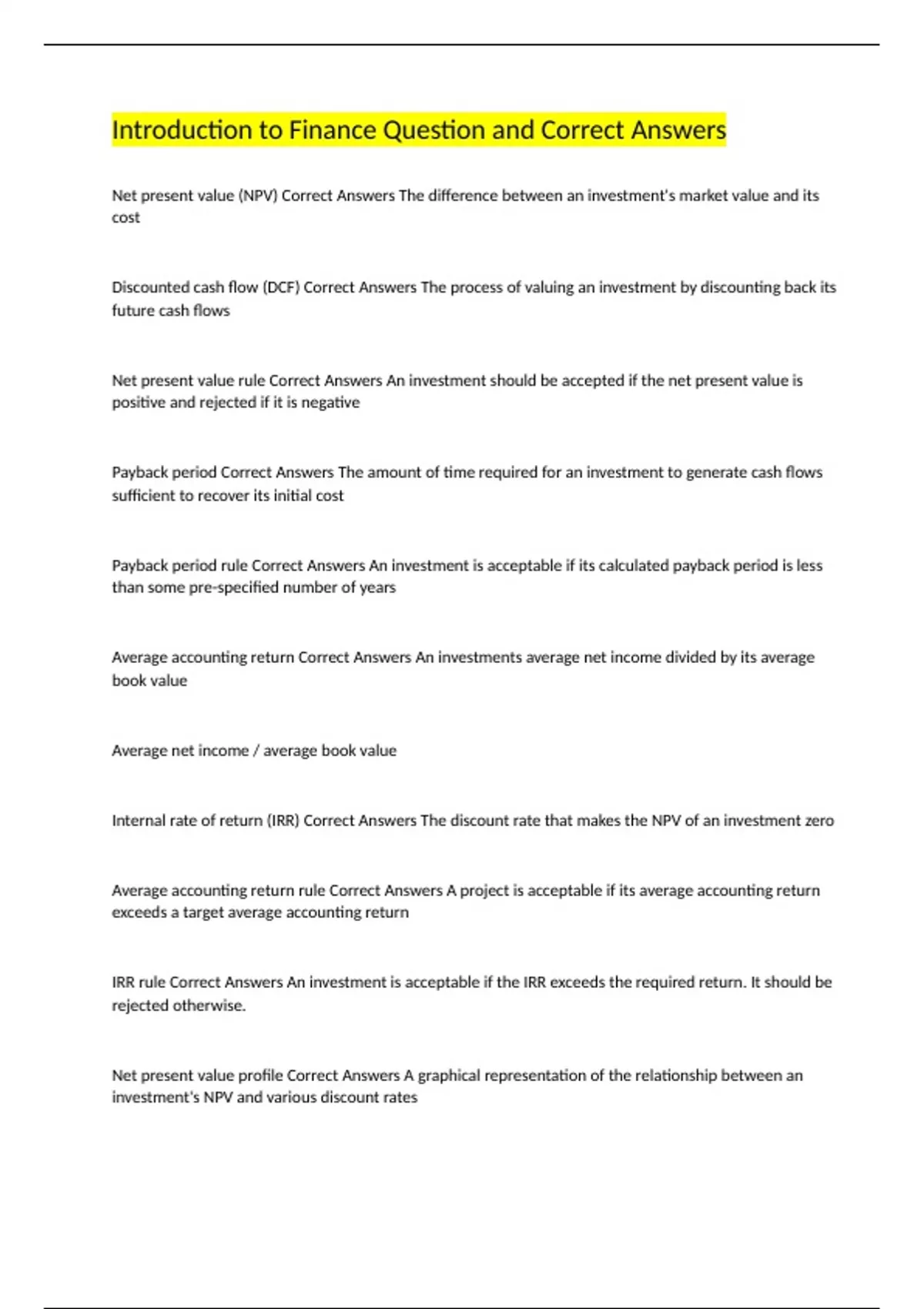 Net present value (NPV) Correct Answers The difference between an investment's market value and its cost Discounted cash flow (DCF) Correct Answers The process of valuing an investment by discounting back its future cash flows Net present value rule Correct Answers An investment should be accepted if the net present value is positive and rejected if it is negative Payback period Correct Answers The amount of time required for an investment to generate cash flows sufficient to recover its initial cost Payback period rule Correct Answers An investment is acceptable if its calculated payback period is less than some pre-specified number of years Average accounting return Correct Answers An investments average net income divided by its average book value Average net income / average book value Internal rate of return (IRR) Correct Answers The discount rate that makes the NPV of an investment zero Average accounting return rule Correct Answers A project is acceptable if its average accounting return exceeds a target average accounting return IRR rule Correct Answers An investment is acceptable if the IRR exceeds the required return. It should be rejected otherwise. Net present value profile Correct Answers A graphical representation of the relationship between an investment's NPV and various discount rates
