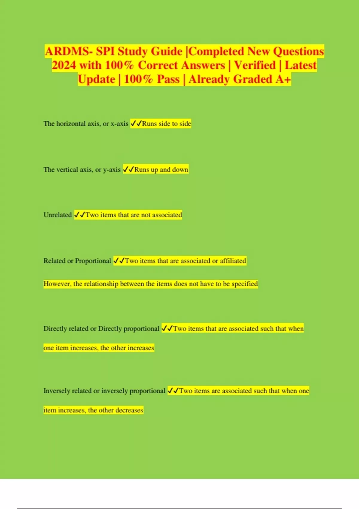 ARDMS- SPI Study Guide |Completed New Questions 2024 with 100% Correct Answers | Verified | Latest Update | 100% Pass | Already Graded A+ The horizontal axis, or x-axis Runs side to side The vertical axis, or y-axis Runs up and down Unrelated Two items that are not associated Related or Proportional Two items that are associated or affiliated However, the relationship between the items does not have to be specified Directly related or Directly proportional Two items that are associated such that when one item increases, the other increases Inversely related or inversely proportional Two items are associated such that when one item increases, the other decreases Reciprocal Relationship When two numbers with a reciprocal relationship are multiplied together, the result is one Reciprocal numbers are inverse because when one increases, the other decreases