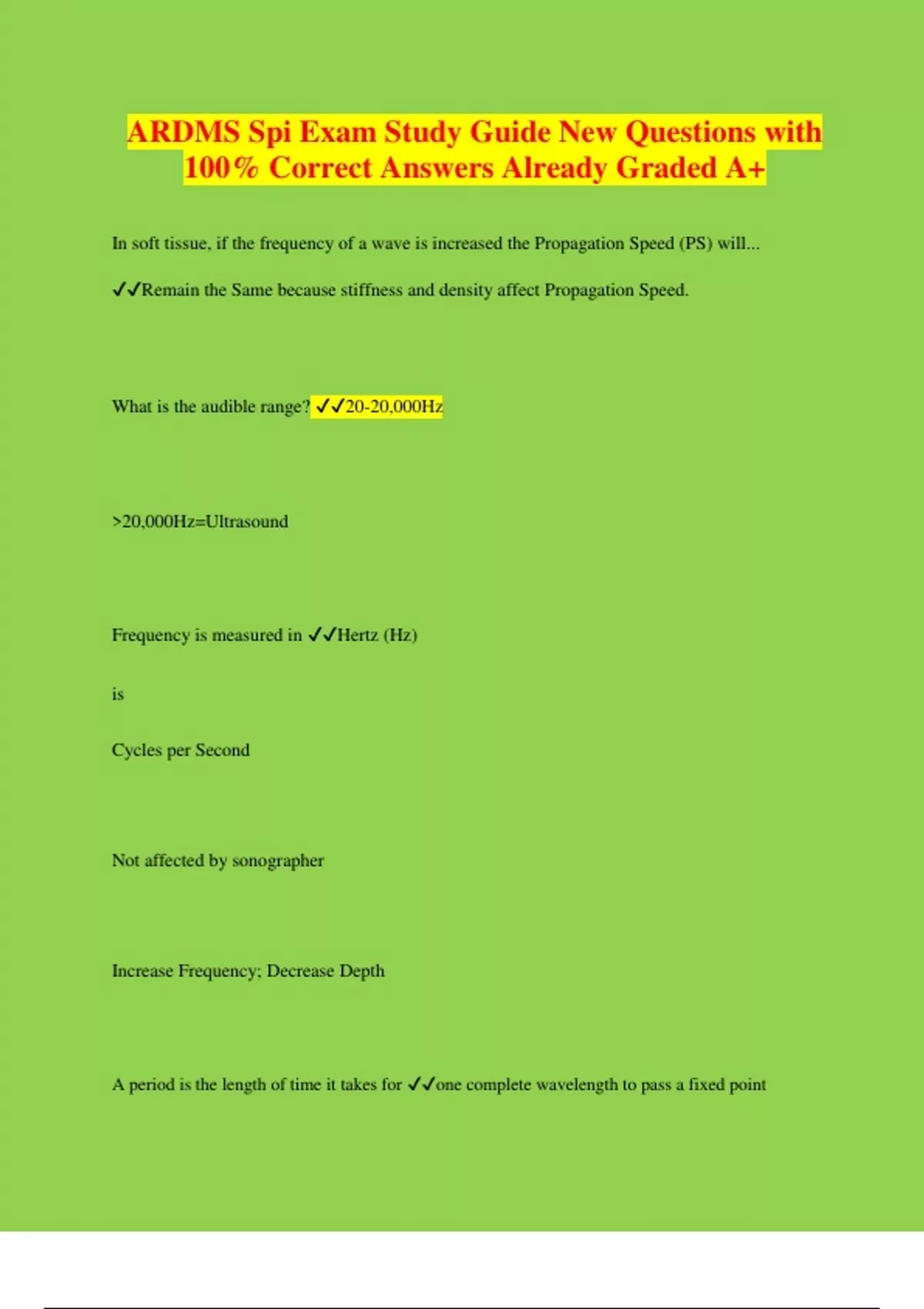 ARDMS Spi Exam Study Guide New Questions with 100% Correct Answers Already Graded A+ In soft tissue, if the frequency of a wave is increased the Propagation Speed (PS) will... Remain the Same because stiffness and density affect Propagation Speed. What is the audible range? 20-20,000Hz >20,000Hz=Ultrasound Frequency is measured in Hertz (Hz) is Cycles per Second Not affected by sonographer Increase Frequency; Decrease Depth A period is the length of time it takes for one complete wavelength to pass a fixed point PRP is determined by Transmit time and receive time. Period is measured in Time (μs) When the sonographer changes the imaging depth what parameters are changed? PRP, PRF, Duty Factor