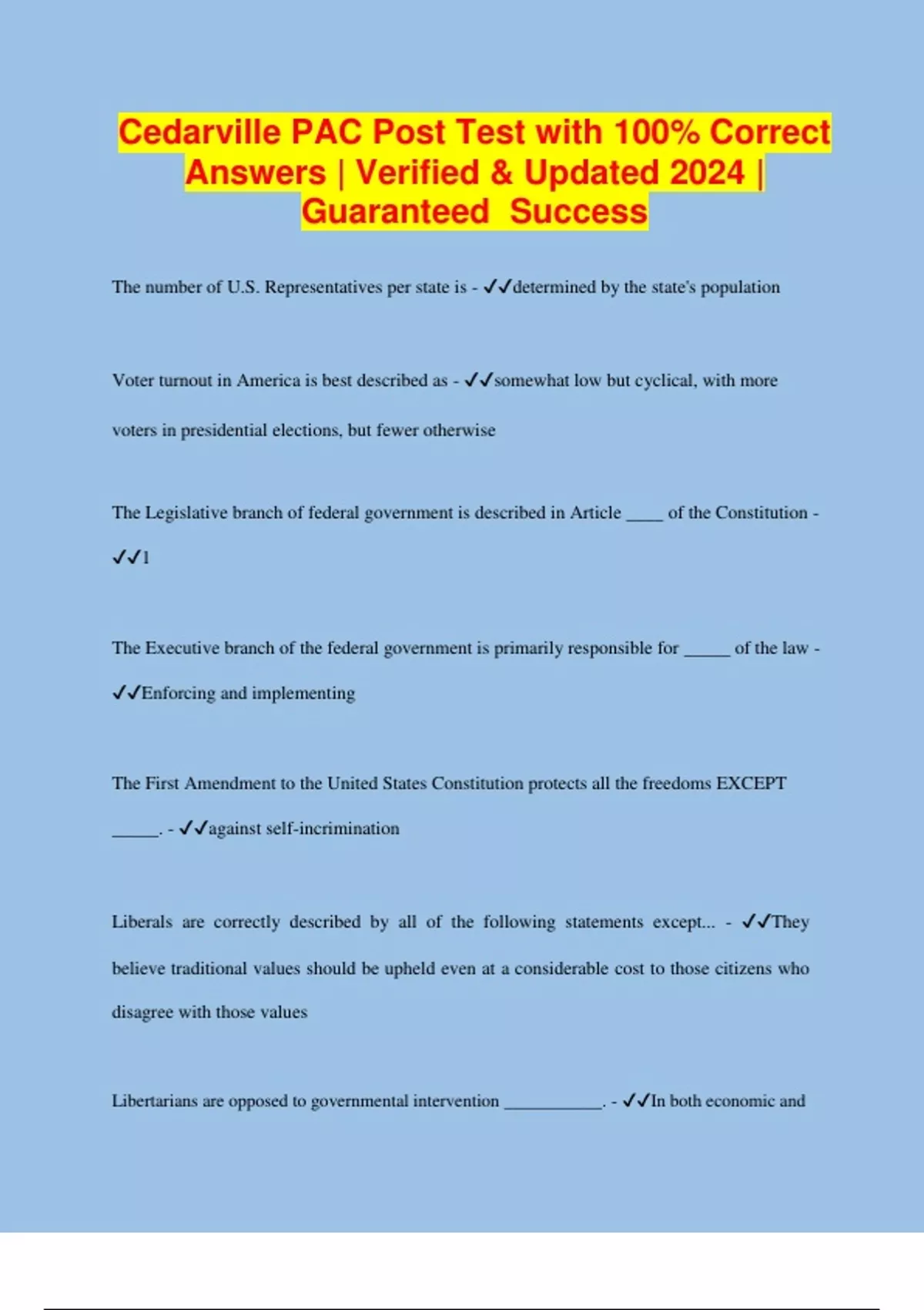 Cedarville PAC Post Test with 100% Correct Answers | Verified & Updated 2024 | Guaranteed Success The number of U.S. Representatives per state is - determined by the state's population Voter turnout in America is best described as - somewhat low but cyclical, with more voters in presidential elections, but fewer otherwise The Legislative branch of federal government is described in Article ____ of the Constitution - 1 The Executive branch of the federal government is primarily responsible for _____ of the law - Enforcing and implementing The First Amendment to the United States Constitution protects all the freedoms EXCEPT _____. - against self-incrimination Liberals are correctly described by all of the following statements except... - They believe traditional values should be upheld even at a considerable cost to those citizens who disagree with those values Libertarians are opposed to governmental intervention ___________. - In both economic and social spheres Our civil liberties are found in... - US Constitution, the Bill of Rights, and other constitutional amendments How many branches are in the federal government? - 3