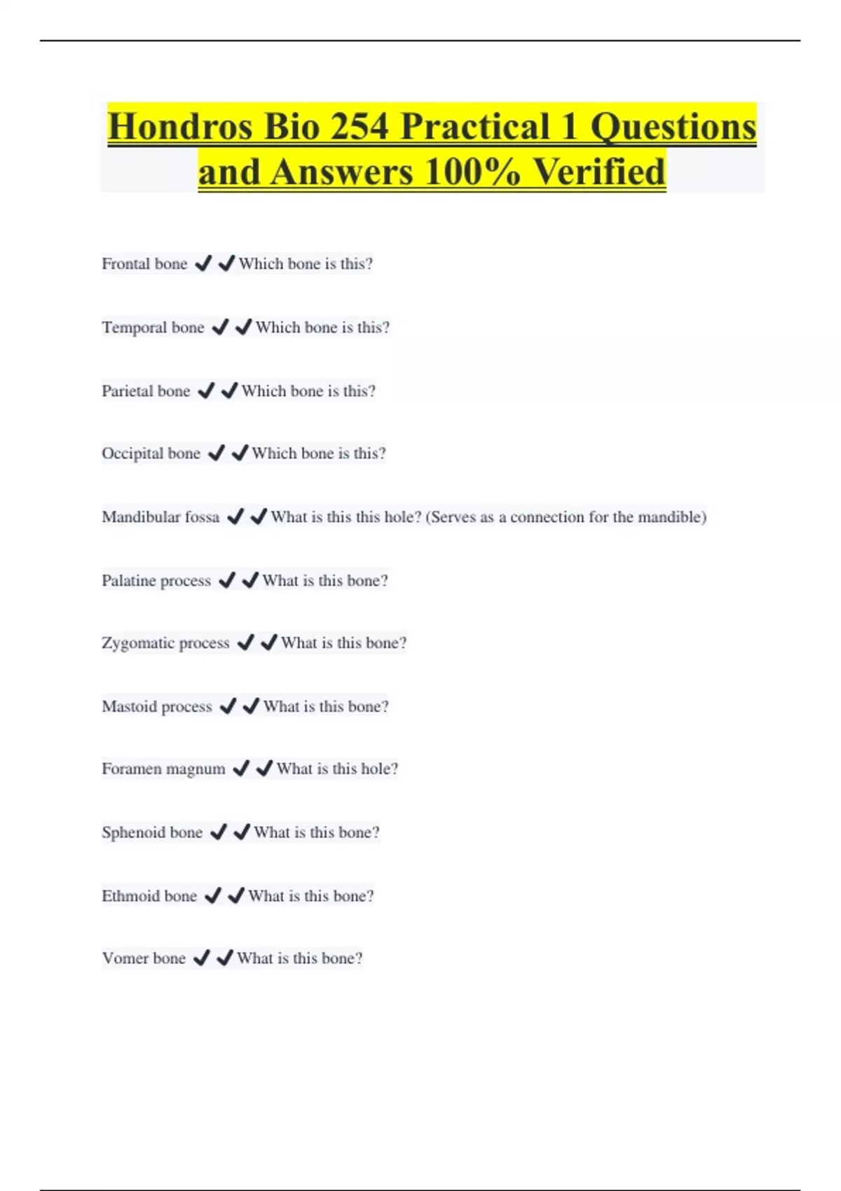 Hondros Bio 254 Practical 1 Questions and Answers 100% Verified Frontal bone ️️Which bone is this? Temporal bone ️️Which bone is this? Parietal bone ️️Which bone is this? Occipital bone ️️Which bone is this? Mandibular fossa ️️What is this this hole? (Serves as a connection for the mandible) Palatine process ️️What is this bone? Zygomatic process ️️What is this bone? Mastoid process ️️What is this bone? Foramen magnum ️️What is this hole? Sphenoid bone ️️What is this bone?