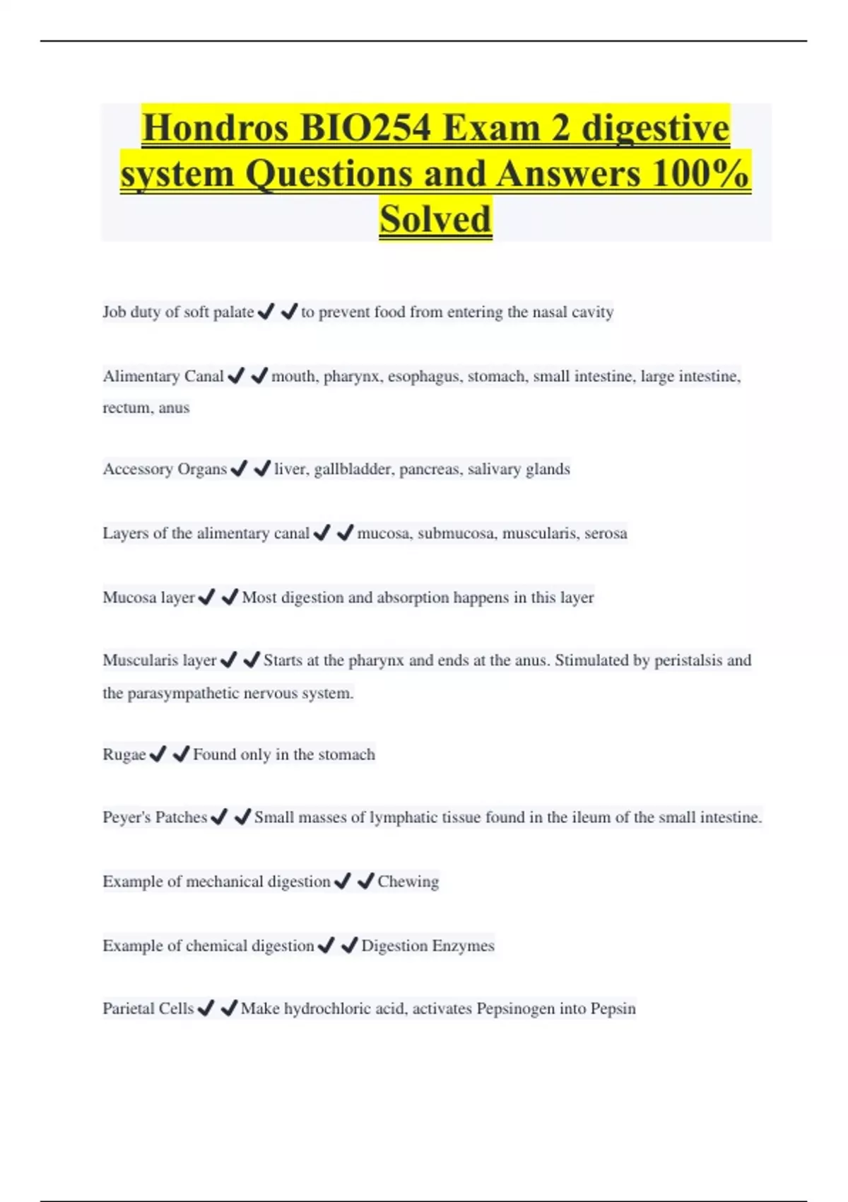 Hondros BIO254 Exam 2 digestive system Questions and Answers 100% Solved Job duty of soft palate️️to prevent food from entering the nasal cavity Alimentary Canal️️mouth, pharynx, esophagus, stomach, small intestine, large intestine, rectum, anus Accessory Organs️️liver, gallbladder, pancreas, salivary glands Layers of the alimentary canal️️mucosa, submucosa, muscularis, serosa Mucosa layer️️Most digestion and absorption happens in this layer Muscularis layer️️Starts at the pharynx and ends at the anus. Stimulated by peristalsis and the parasympathetic nervous system. Rugae️️Found only in the stomach