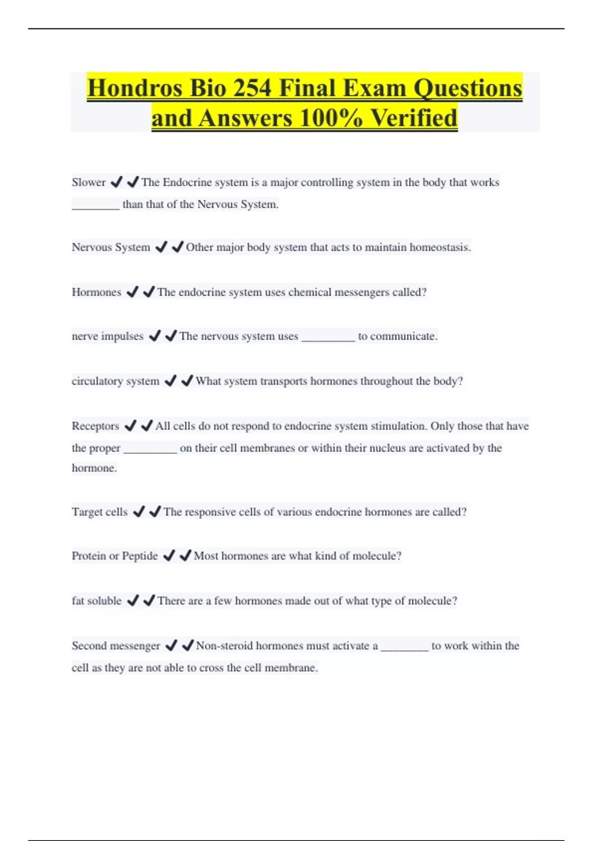 Hondros Bio 254 Final Exam Questions and Answers 100% Verified Slower ️️The Endocrine system is a major controlling system in the body that works ________ than that of the Nervous System. Nervous System ️️Other major body system that acts to maintain homeostasis. Hormones ️️The endocrine system uses chemical messengers called? nerve impulses ️️The nervous system uses _________ to communicate. circulatory system ️️What system transports hormones throughout the body? Receptors ️️All cells do not respond to endocrine system stimulation. Only those that have the proper _________ on their cell membranes or within their nucleus are activated by the hormone. Target cells ️️The responsive cells of various endocrine hormones are called? Protein or Peptide ️️Most hormones are what kind of molecule? fat soluble ️️There are a few hormones made out of what type of molecule? Second messenger ️️Non-steroid hormones must activate a ________ to work within the cell as they are not able to cross the cell membrane.