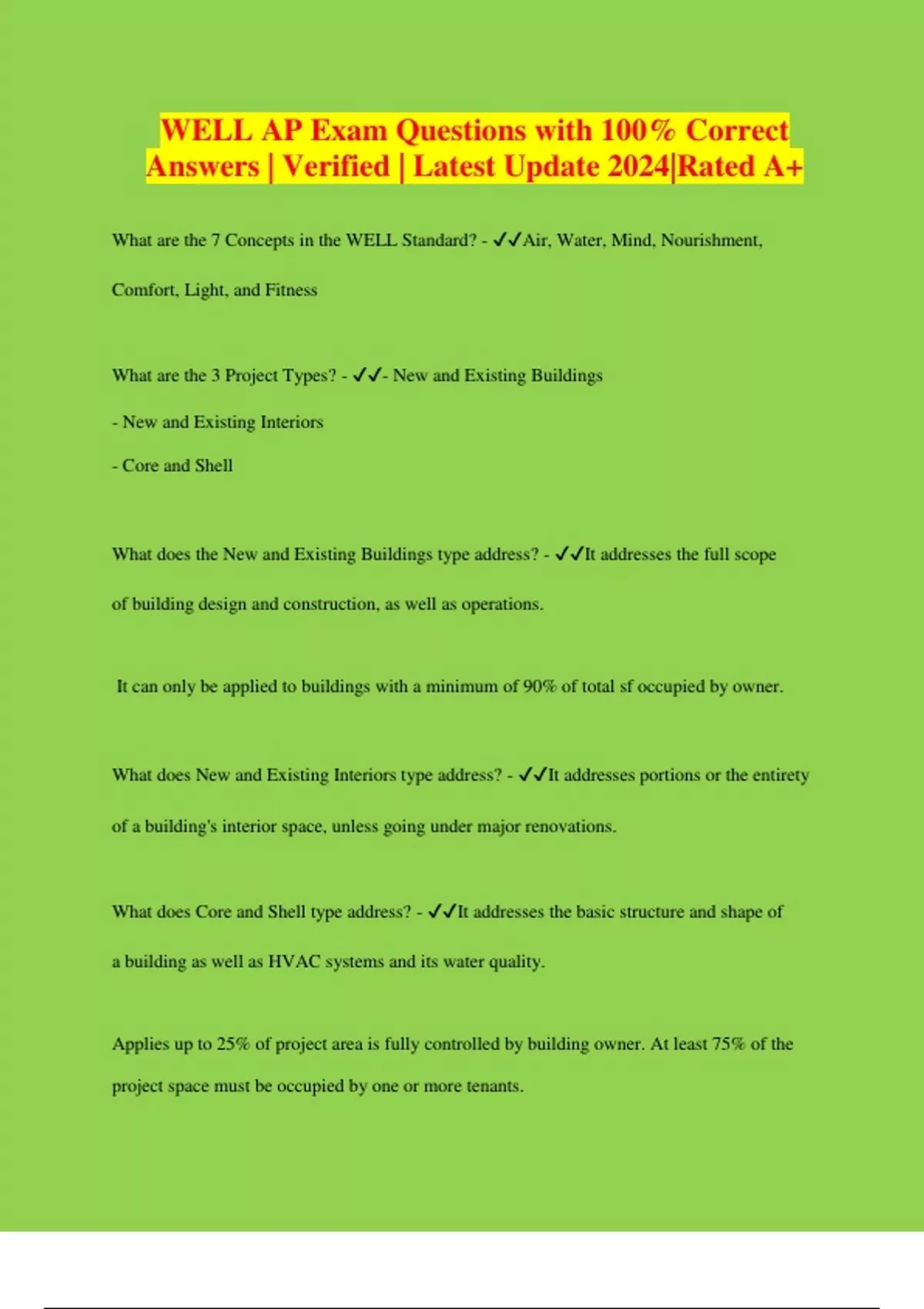 WELL AP Exam Questions with 100% Correct Answers | Verified | Latest Update 2024|Rated A+ What are the 7 Concepts in the WELL Standard? - Air, Water, Mind, Nourishment, Comfort, Light, and Fitness What are the 3 Project Types? - - New and Existing Buildings - New and Existing Interiors - Core and Shell What does the New and Existing Buildings type address? - It addresses the full scope of building design and construction, as well as operations. It can only be applied to buildings with a minimum of 90% of total sf occupied by owner. What does New and Existing Interiors type address? - It addresses portions or the entirety of a building's interior space, unless going under major renovations. What does Core and Shell type address? - It addresses the basic structure and shape of a building as well as HVAC systems and its water quality. Applies up to 25% of project area is fully controlled by building owner. At least 75% of the project space must be occupied by one or more tenants. How many preconditions and optimizations are in each project type? - - New and Existing Building: 41 preconditions, 59 optimizations (100 total) - New and Existing Interior: 36 preconditions, 62 optimizations (98 total) - Core and Shell: 26 preconditions, 28 optimizations (54 total) What are the 6 Pilot Programs for the WELL Standard? - - Multifamily Residential: have at least 5 dwellings - Educational facilities - Retail - Restaurant - Commercial Kitchens - Communities: Meet minimum occupancy, building size, and use requirements