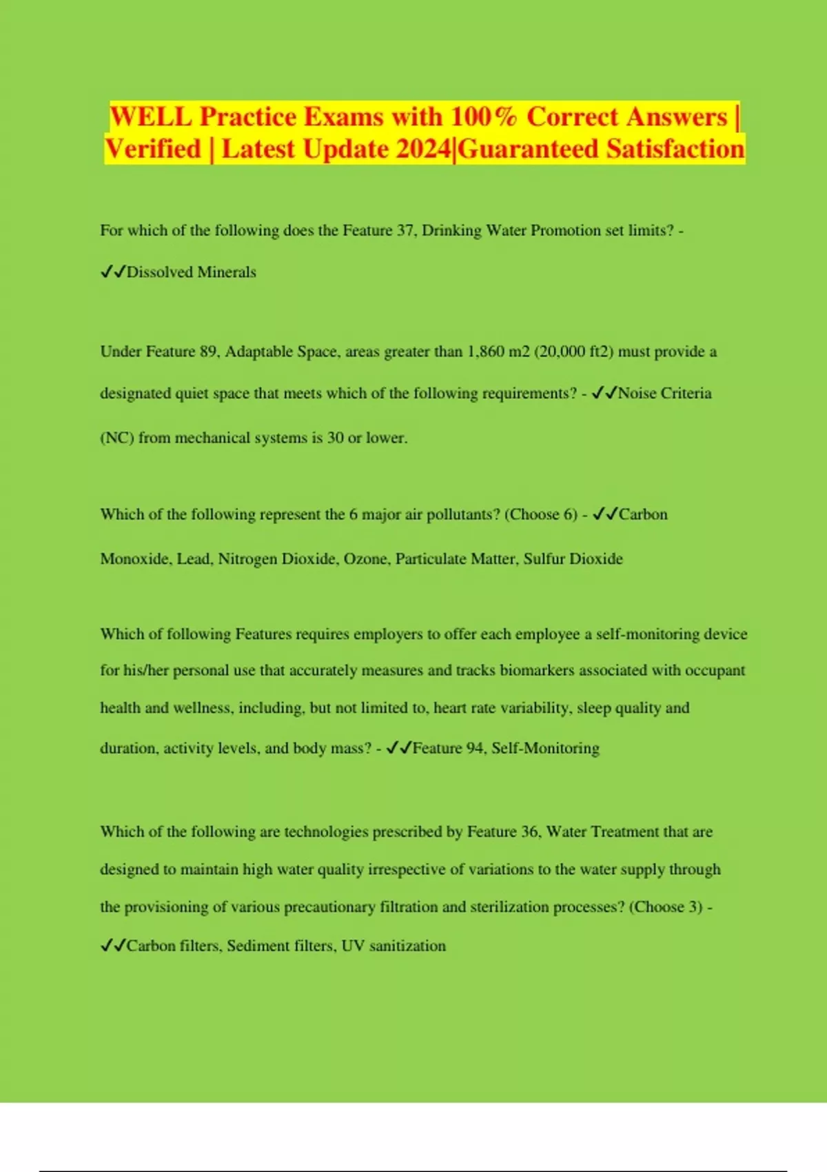 WELL Practice Exams with 100% Correct Answers | Verified | Latest Update 2024|Guaranteed Satisfaction For which of the following does the Feature 37, Drinking Water Promotion set limits? - Dissolved Minerals Under Feature 89, Adaptable Space, areas greater than 1,860 m2 (20,000 ft2) must provide a designated quiet space that meets which of the following requirements? - Noise Criteria (NC) from mechanical systems is 30 or lower. Which of the following represent the 6 major air pollutants? (Choose 6) - Carbon Monoxide, Lead, Nitrogen Dioxide, Ozone, Particulate Matter, Sulfur Dioxide Which of following Features requires employers to offer each employee a self-monitoring device for his/her personal use that accurately measures and tracks biomarkers associated with occupant health and wellness, including, but not limited to, heart rate variability, sleep quality and duration, activity levels, and body mass? - Feature 94, Self-Monitoring Which of the following are technologies prescribed by Feature 36, Water Treatment that are designed to maintain high water quality irrespective of variations to the water supply through the provisioning of various precautionary filtration and sterilization processes? (Choose 3) - Carbon filters, Sediment filters, UV sanitization